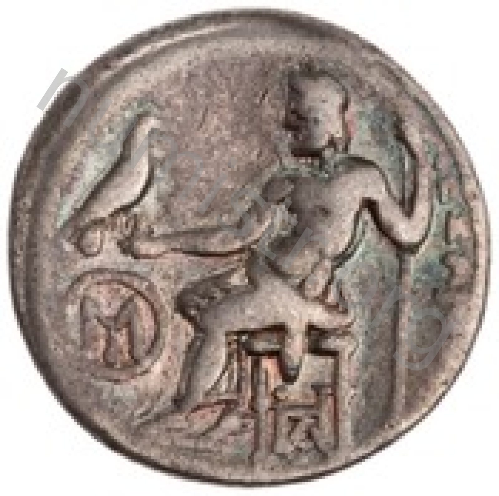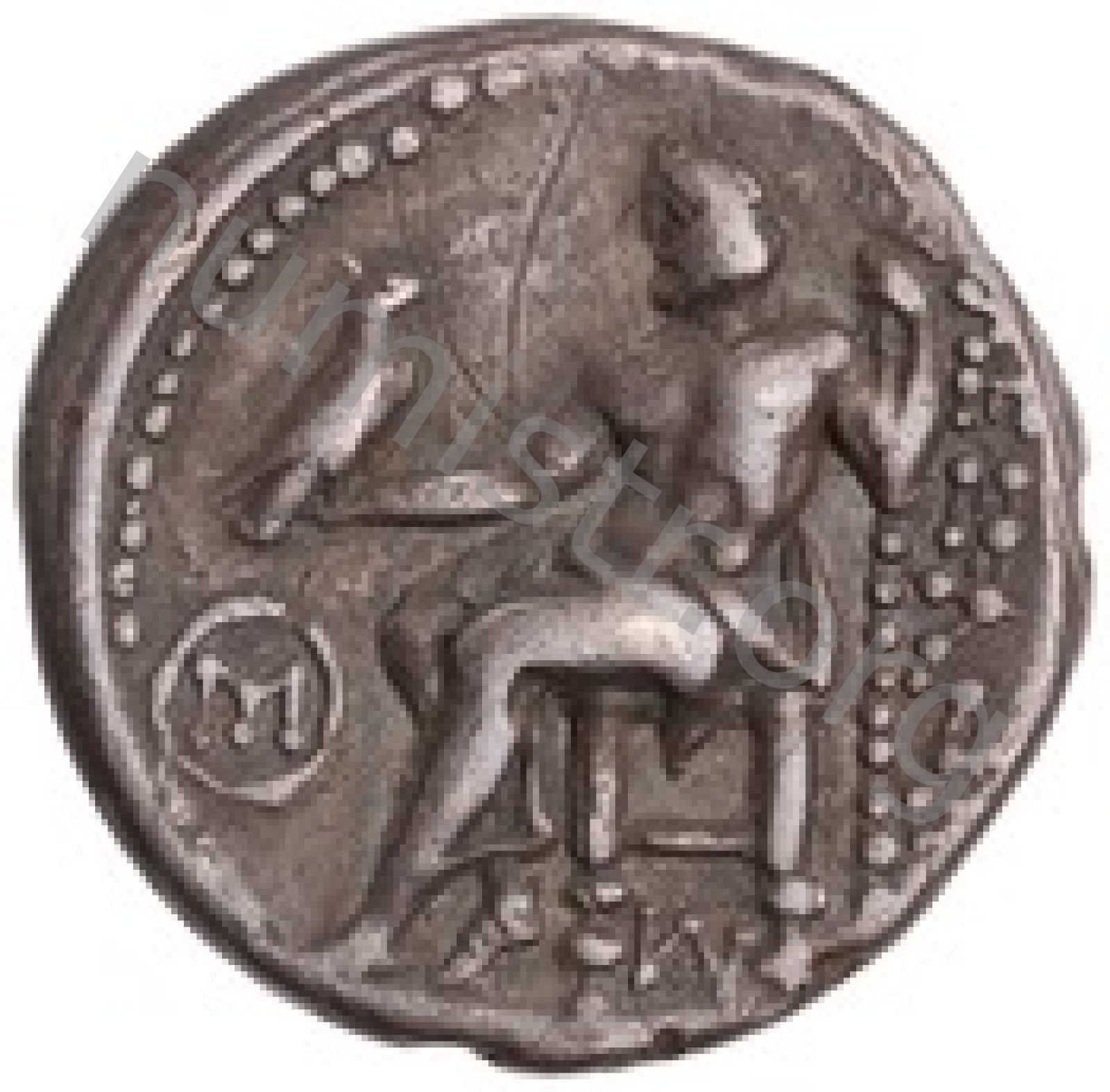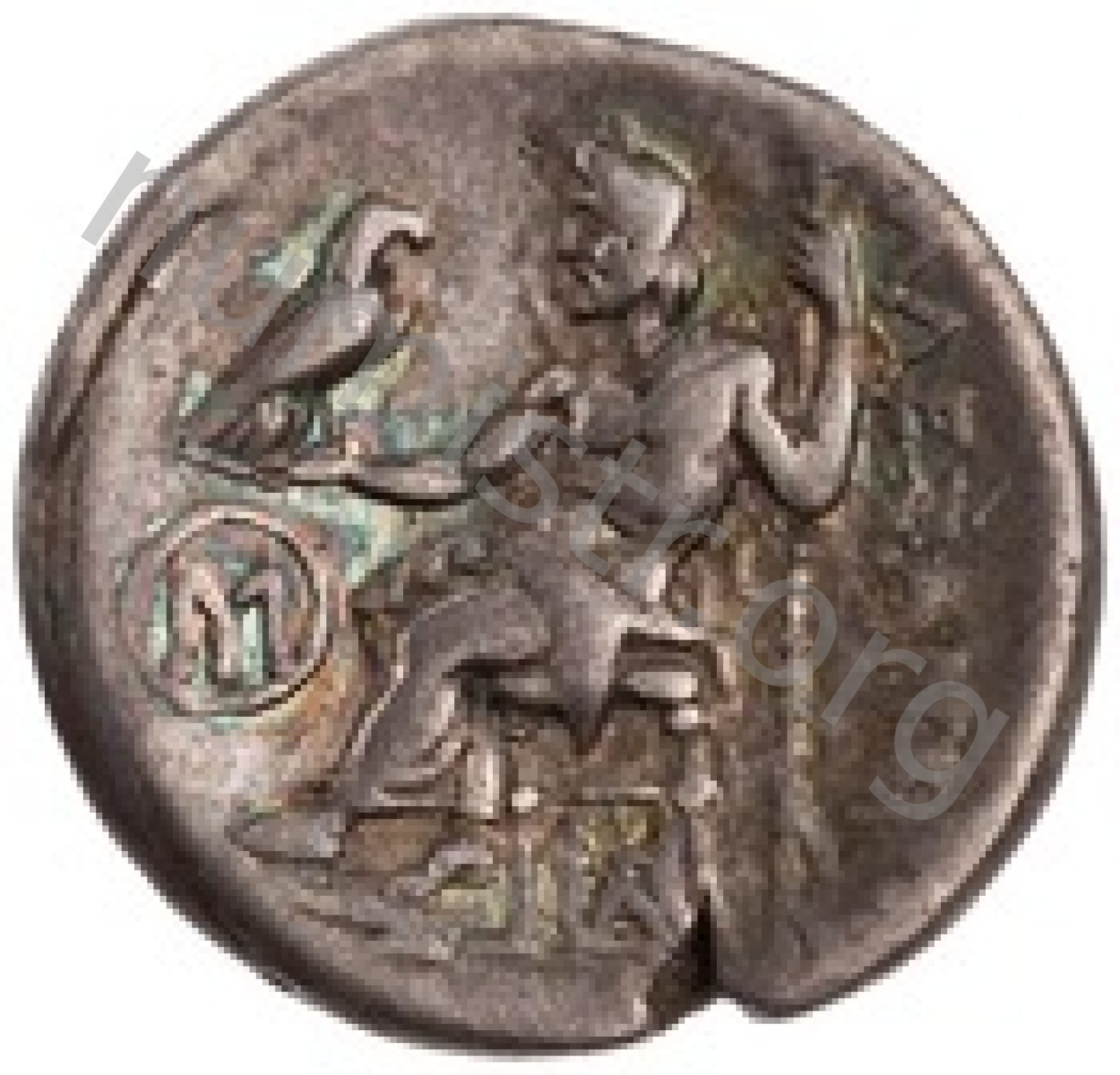 Zeus tabure-tahtta oturuyor sol elinde kartal sağ elinde asa var.