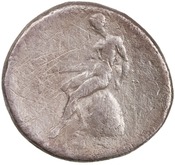 Apollo wearing sandals seated left on omphalos holding two arrows and resting left hand on grounded bow -[en]