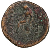 Apollo seated left on omphalos testing arrow and resting left hand on grounded bow -[en]