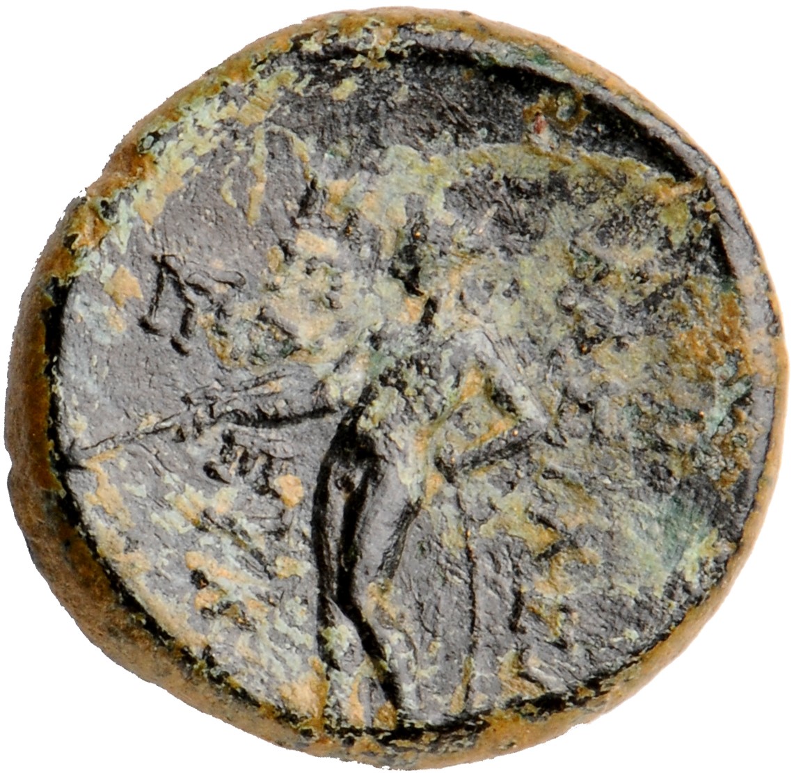 Apollo standing left testing arrow and resting left hand on grounded bow -[en]