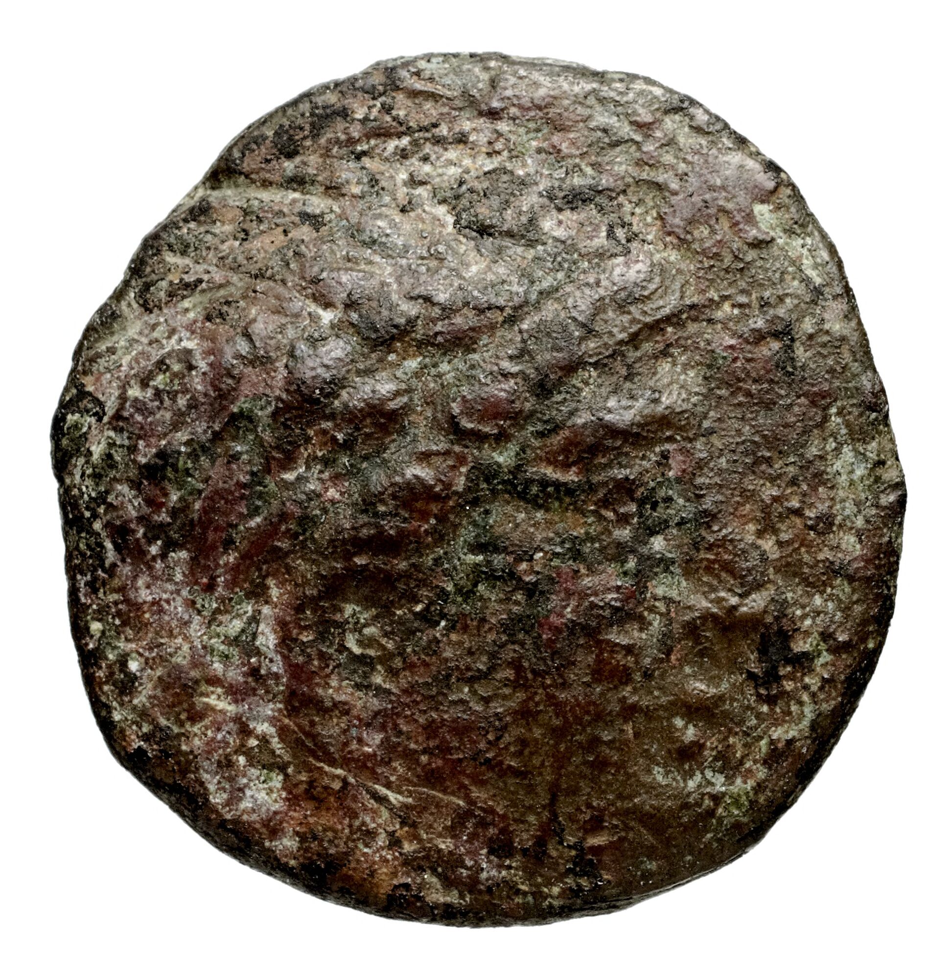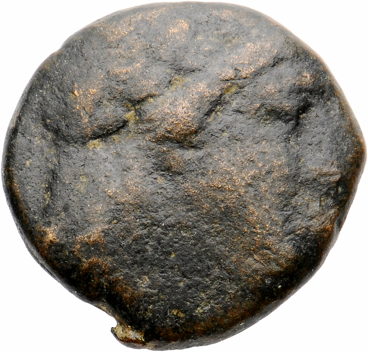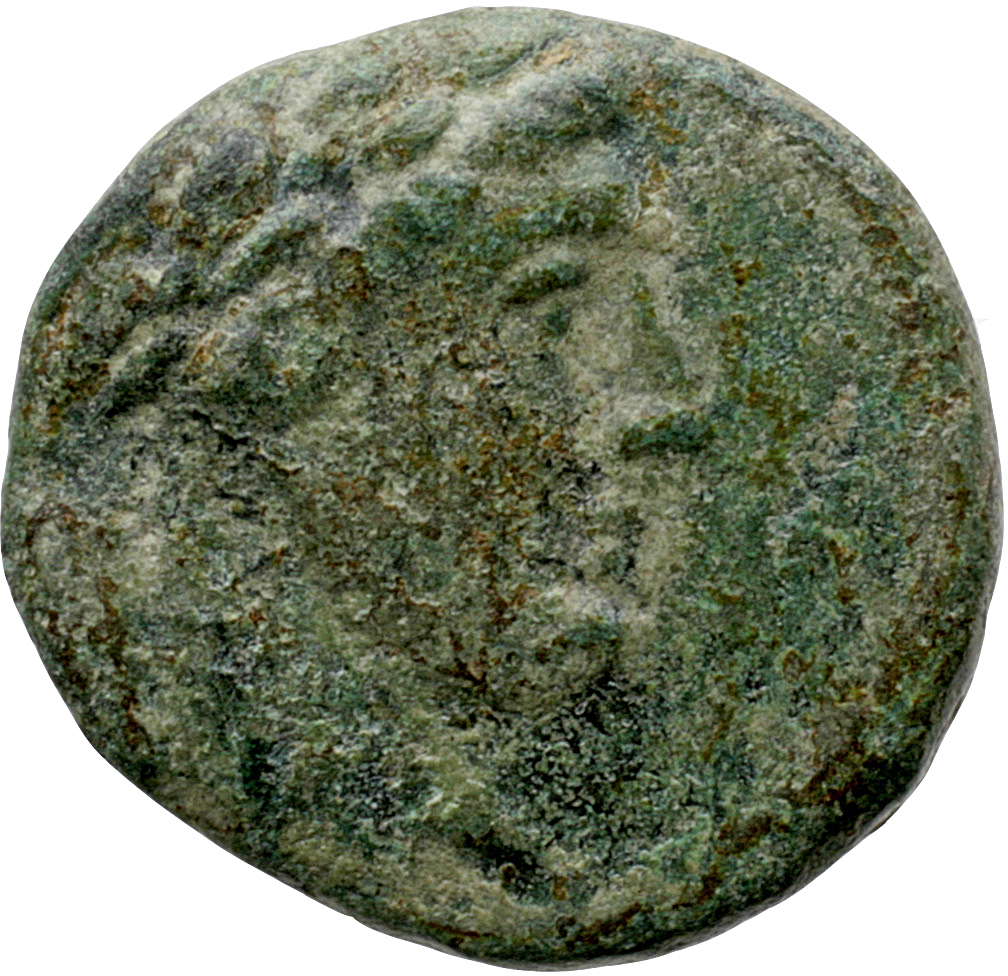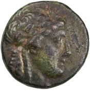Apollon'un defne taçlı başı sağa doğru kıvrılmış buklelerle