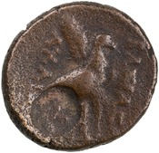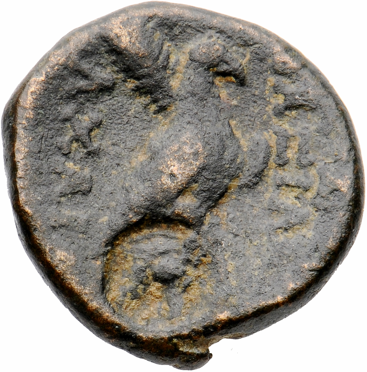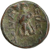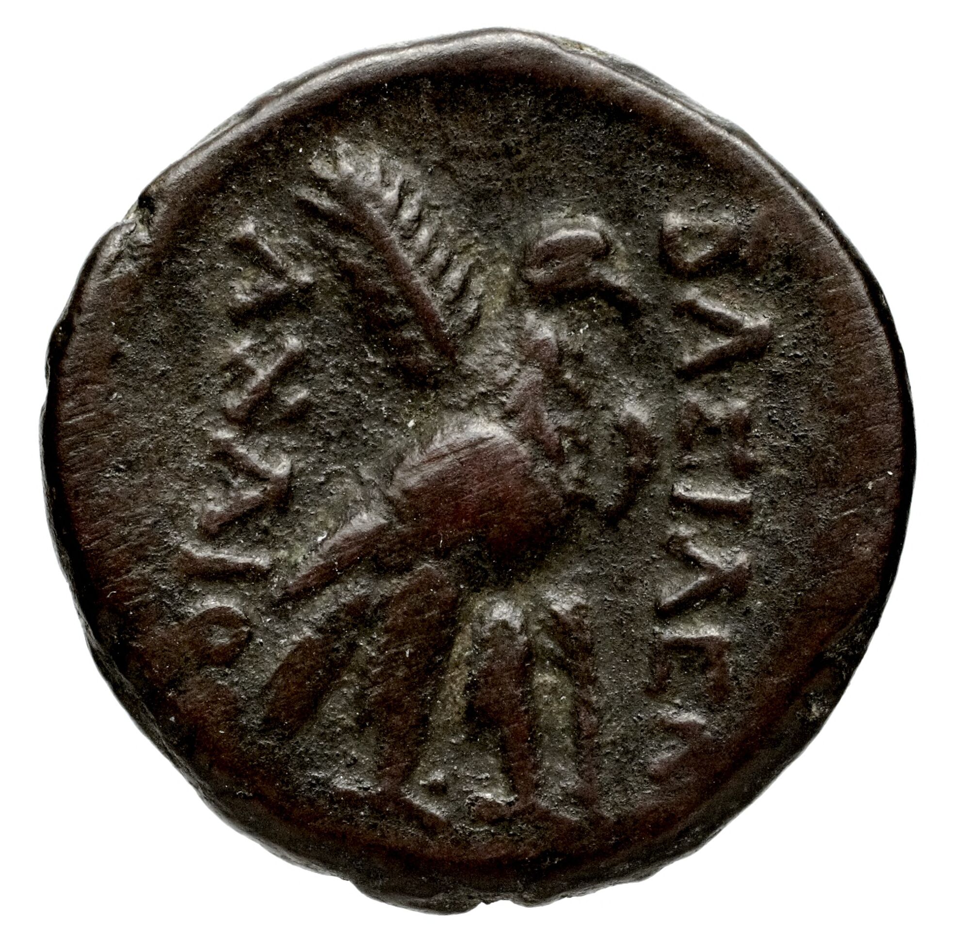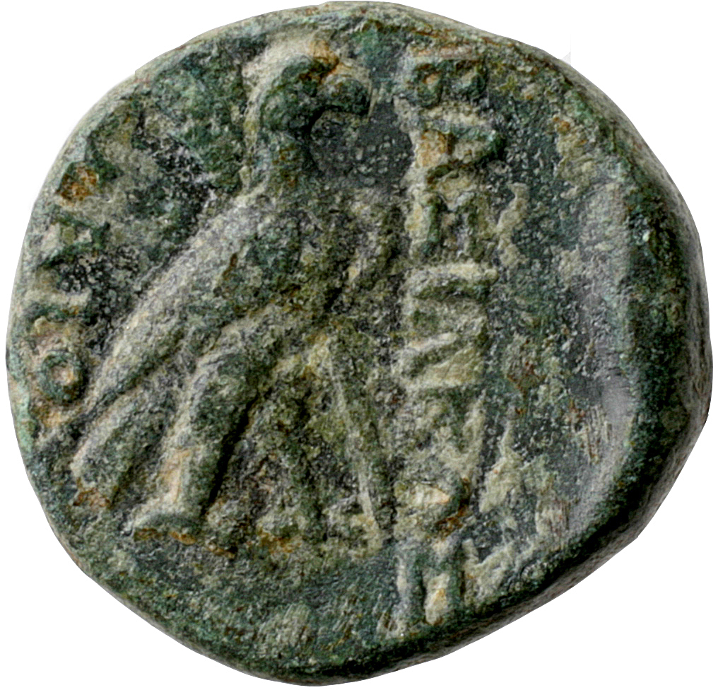 Apollon'un defne taçlı başı sağa doğru kıvrılmış buklelerle