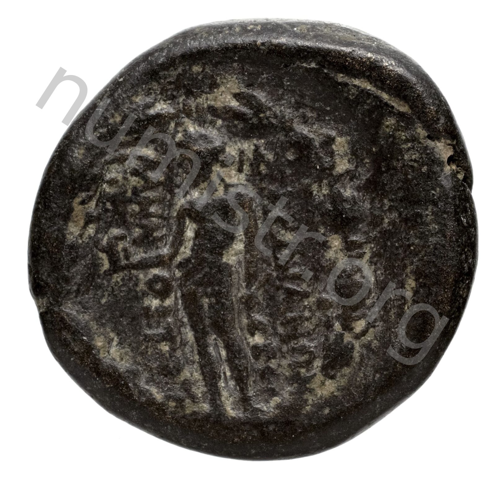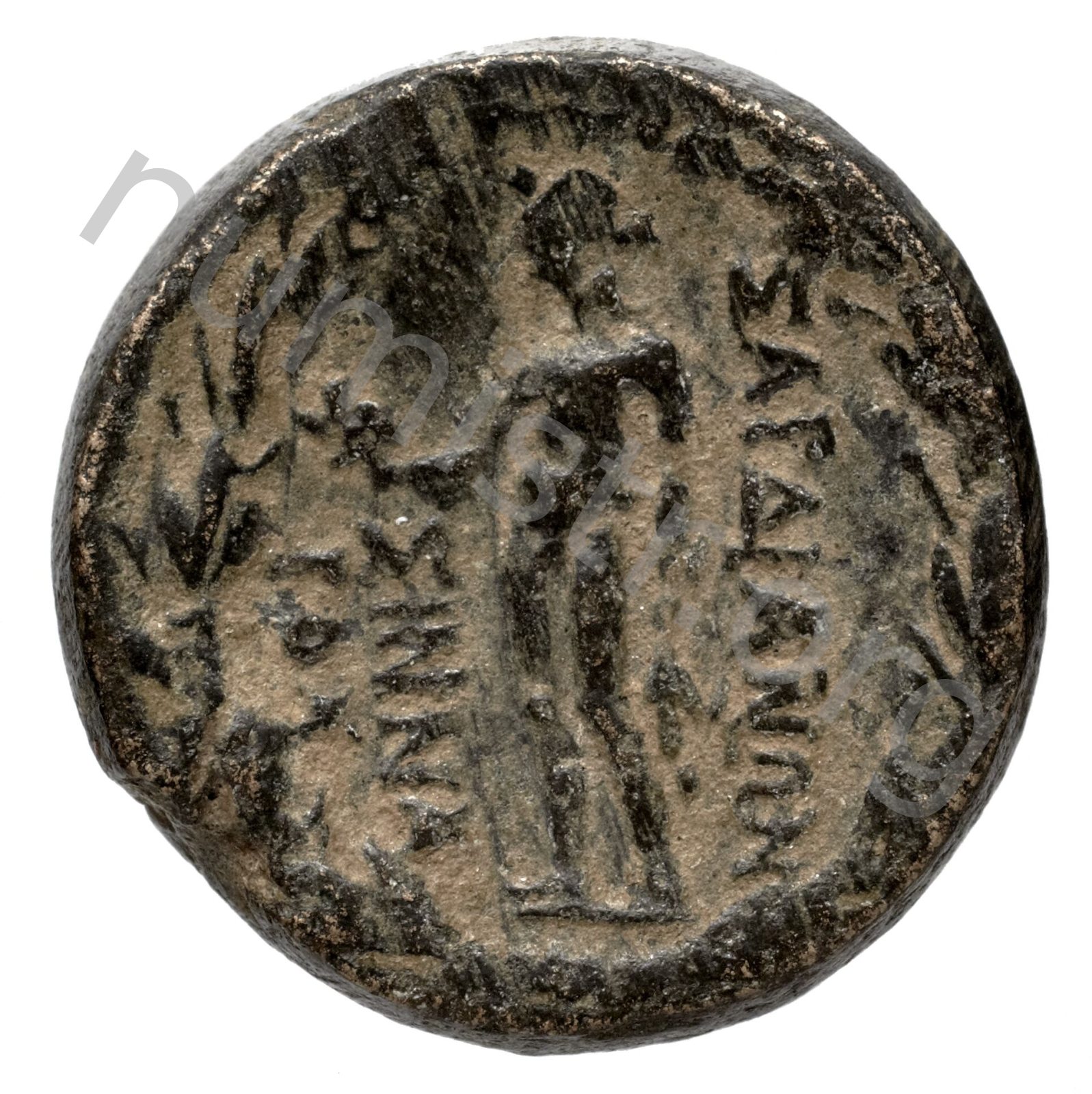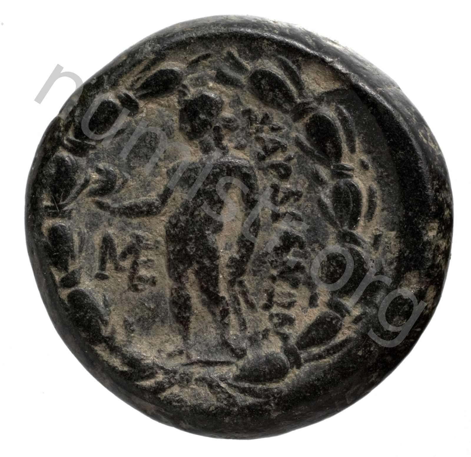 Apollon'un üçte ikisi çıplak bir şekilde elinde bir kuş (?) ve bir lir (?) tutuyor; hepsi defne çelengi içinde
