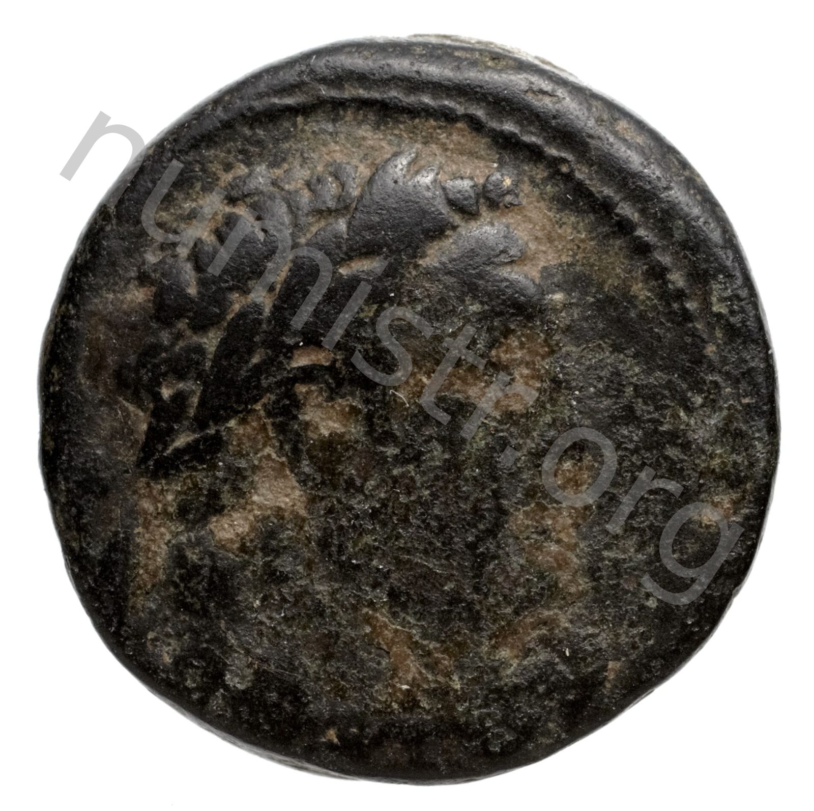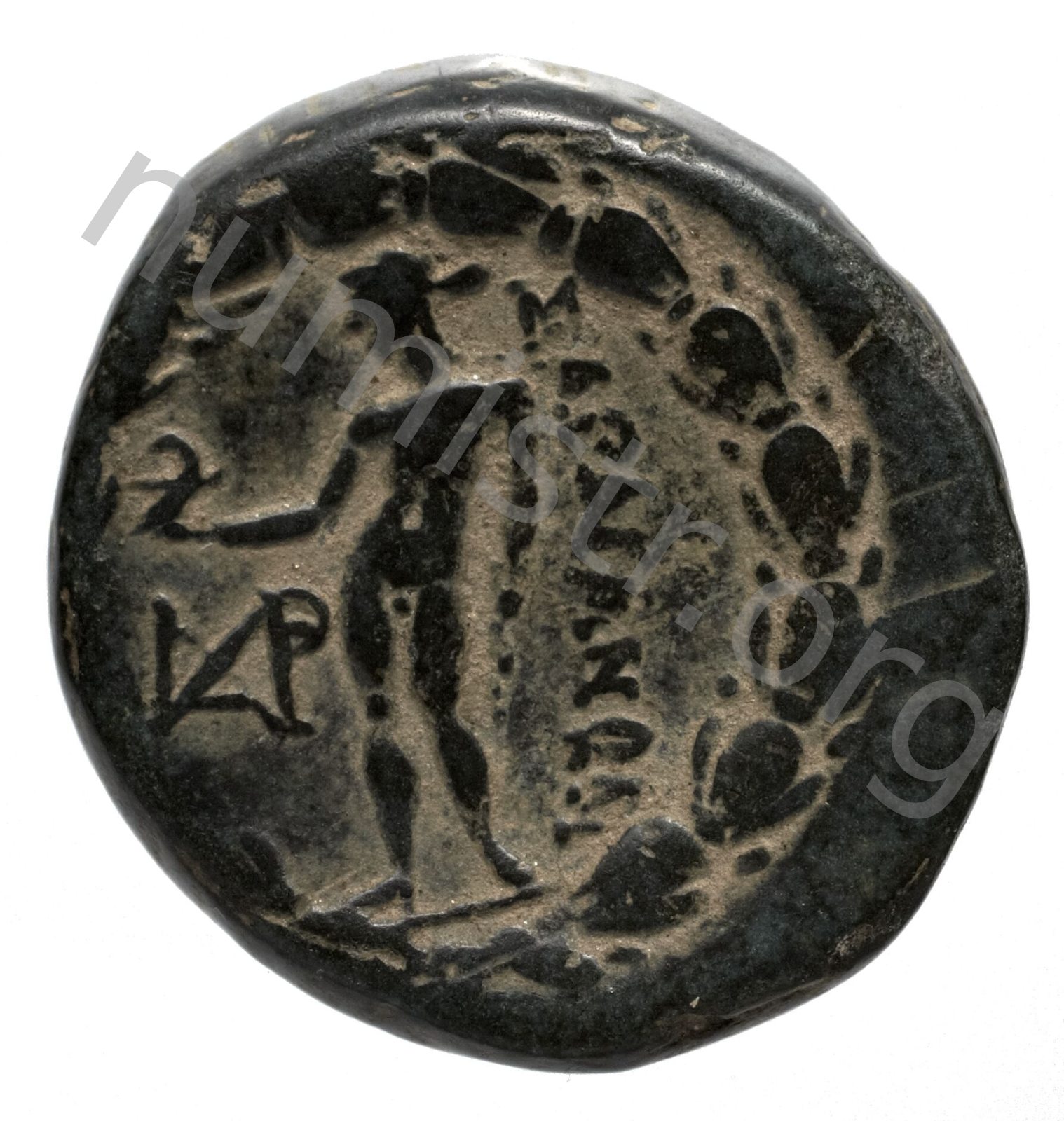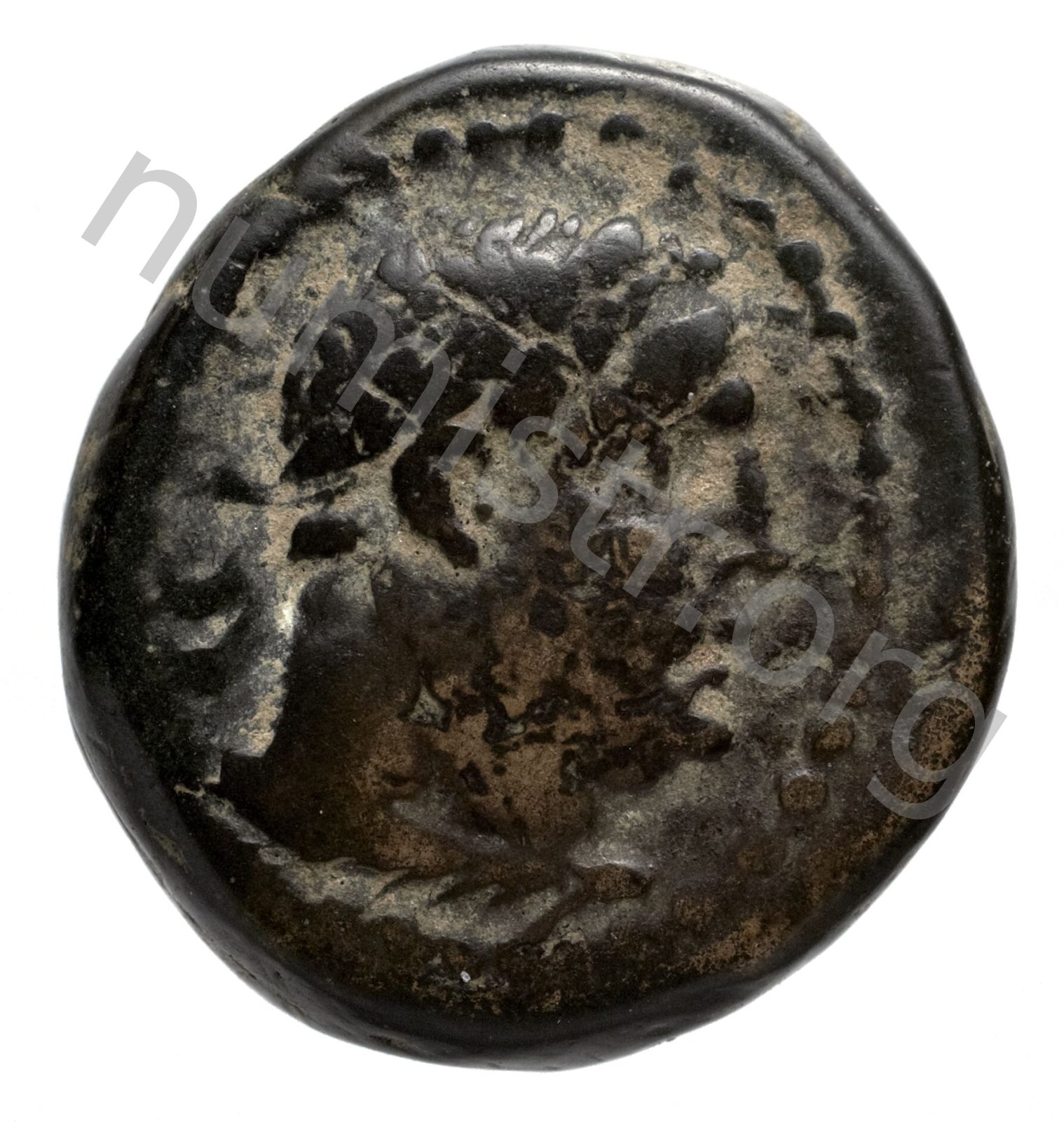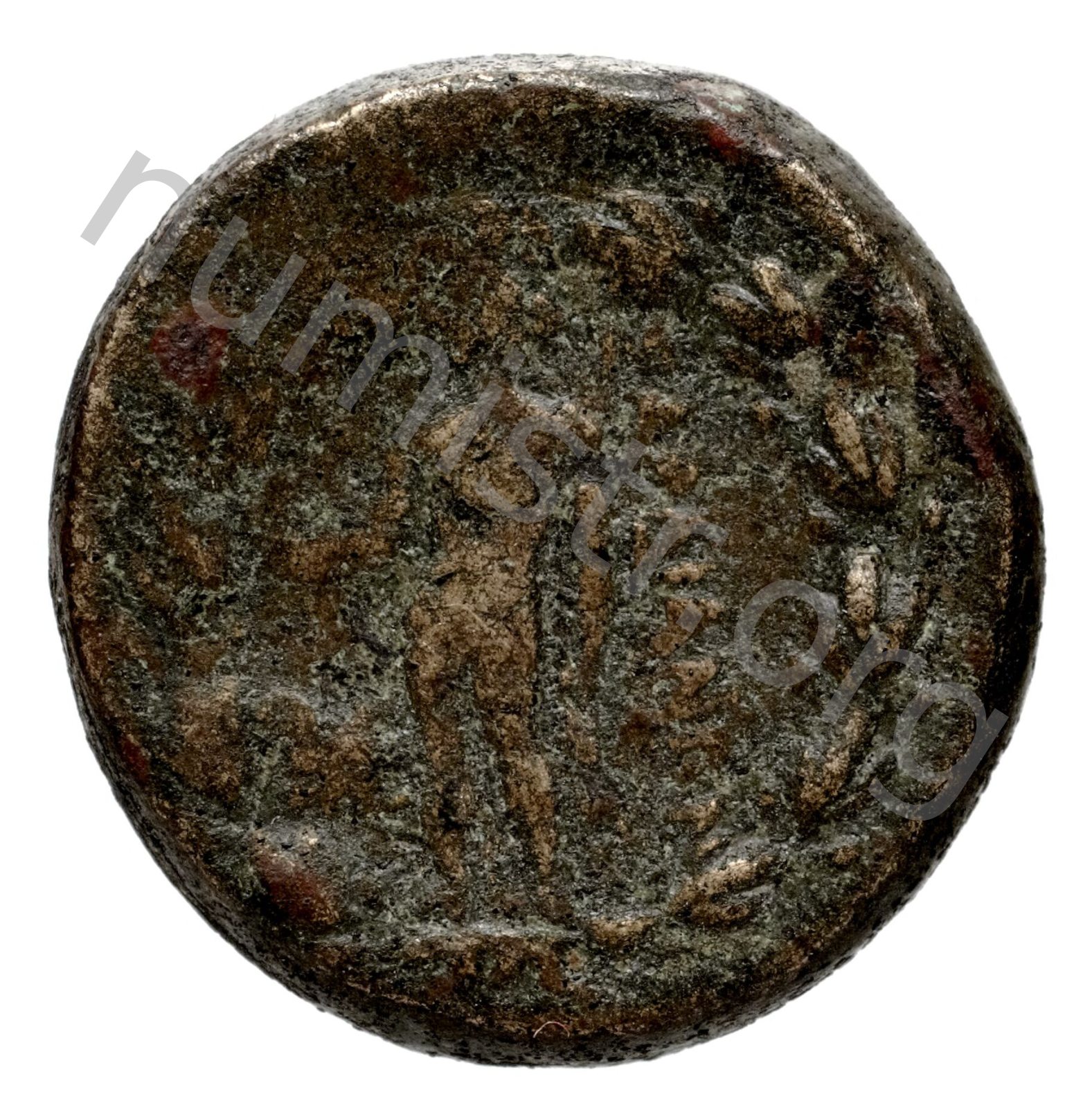 Apollo three-quarters facing naked holding a bird (?) and a lyre (?); all in a laurel wreath -[en]