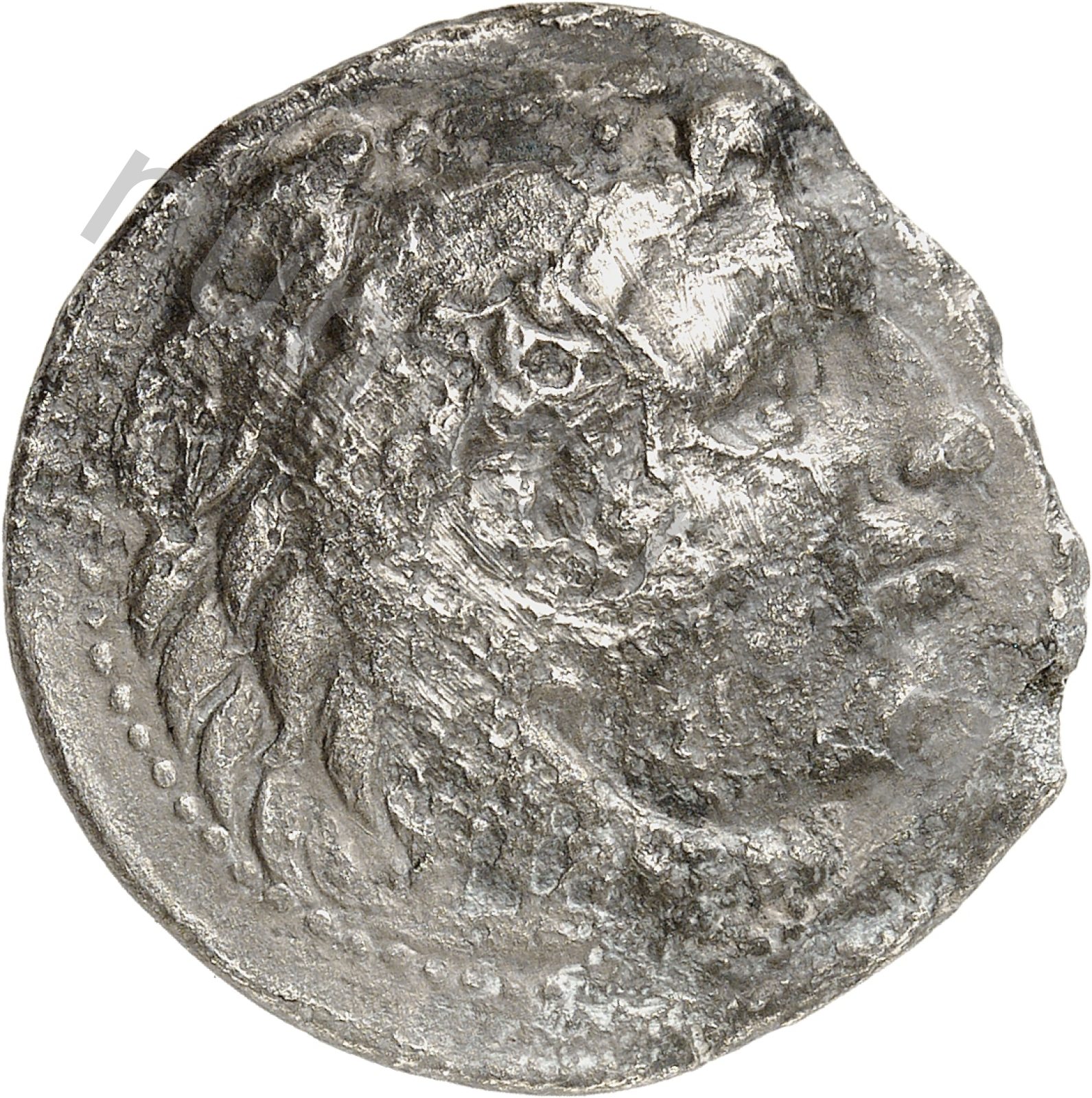 Head of beardless Heracles right wearing lion skin headdress -[en]