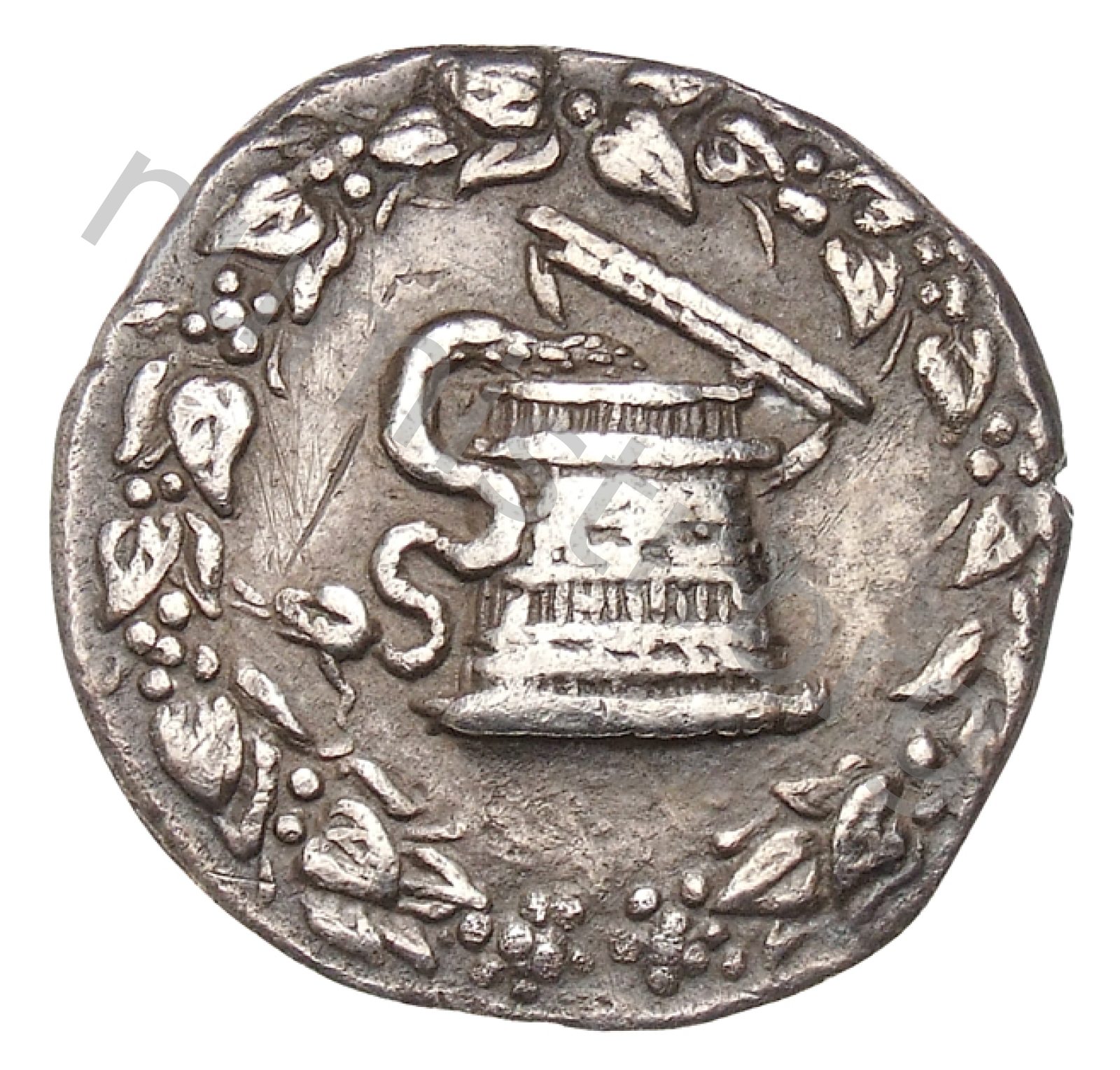 Aplustre ile süslenmiş ve iki iç içe geçmiş yılan arasında bir yay bulunan gorytos (yay kılıfı); yanında thyrsus (çam kozalağı ile taçlandırılmış ve kurdelelerle süslenmiş asa)
