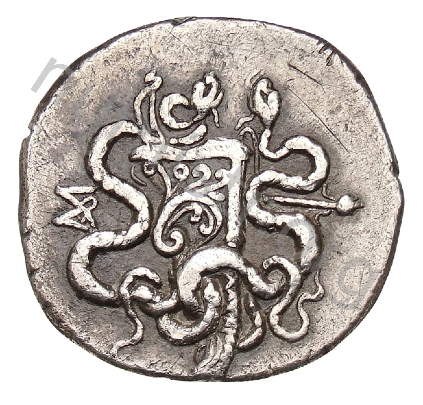 Gorytos (bow case) decorated with an aplustre and containing a bow between two intertwined snakes; to side thyrsus (sceptre surmounted by a pine cone and adorned with ribbons) -[en]