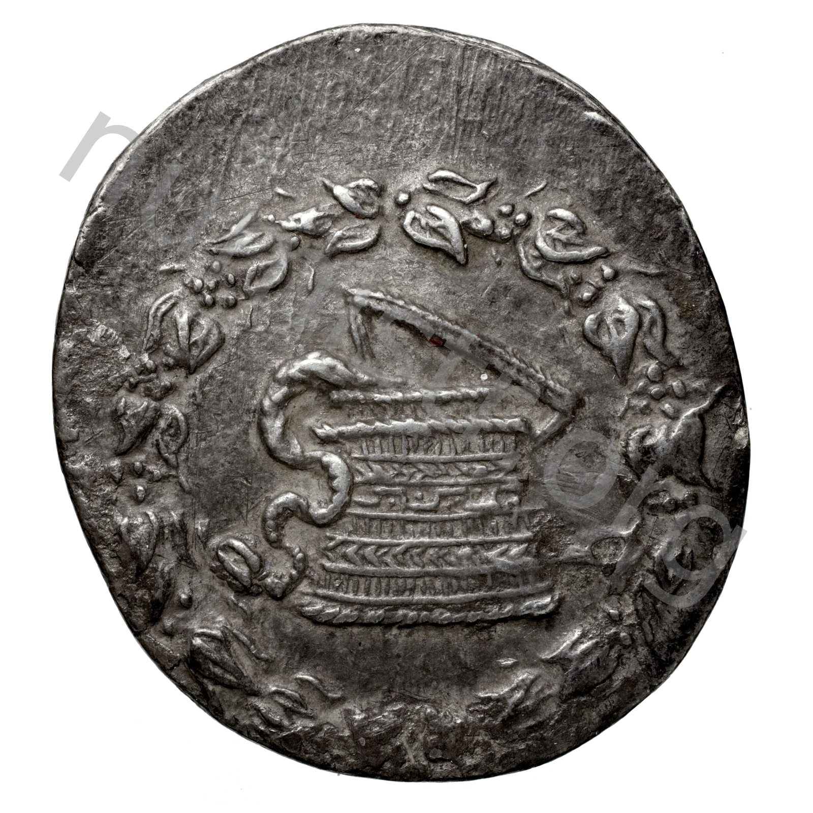 Basket (cista mystica) from which a snake emerges in a wreath of ivy -[en]