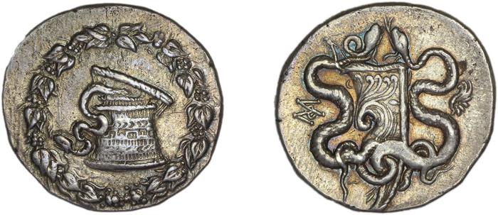 Basket (cista mystica) from which a snake emerges in a wreath of ivy -[en]