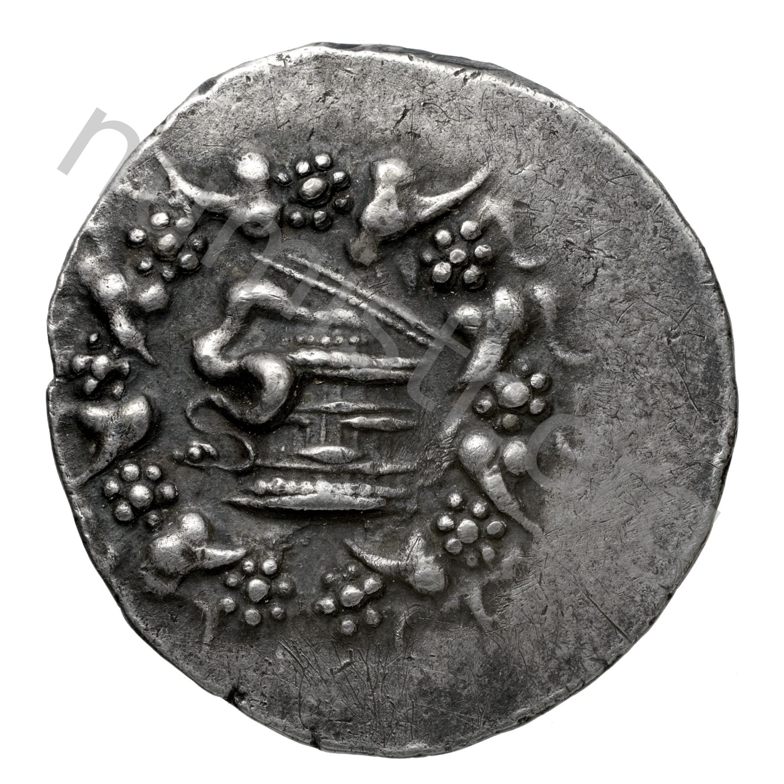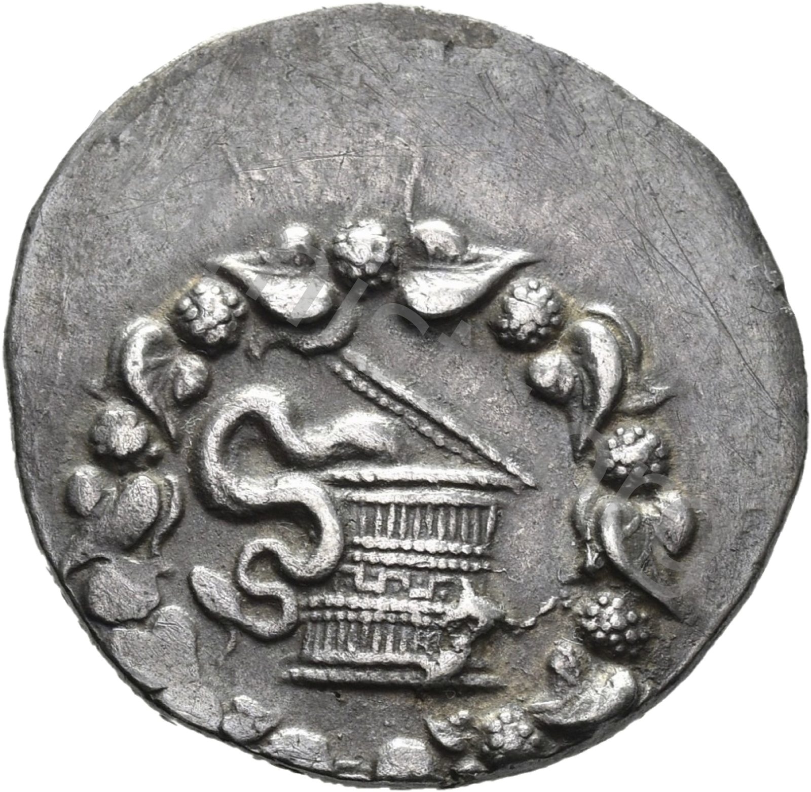 Basket (cista mystica) from which a snake emerges in a wreath of ivy -[en]