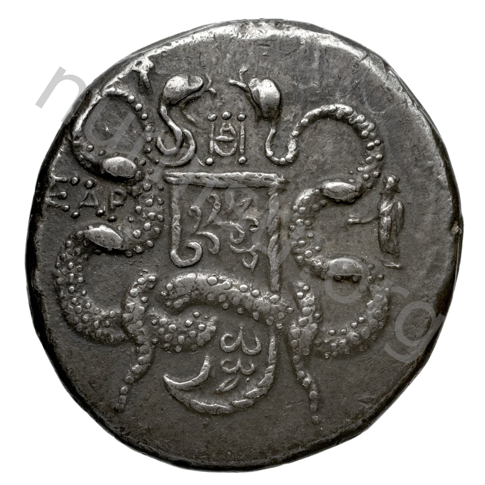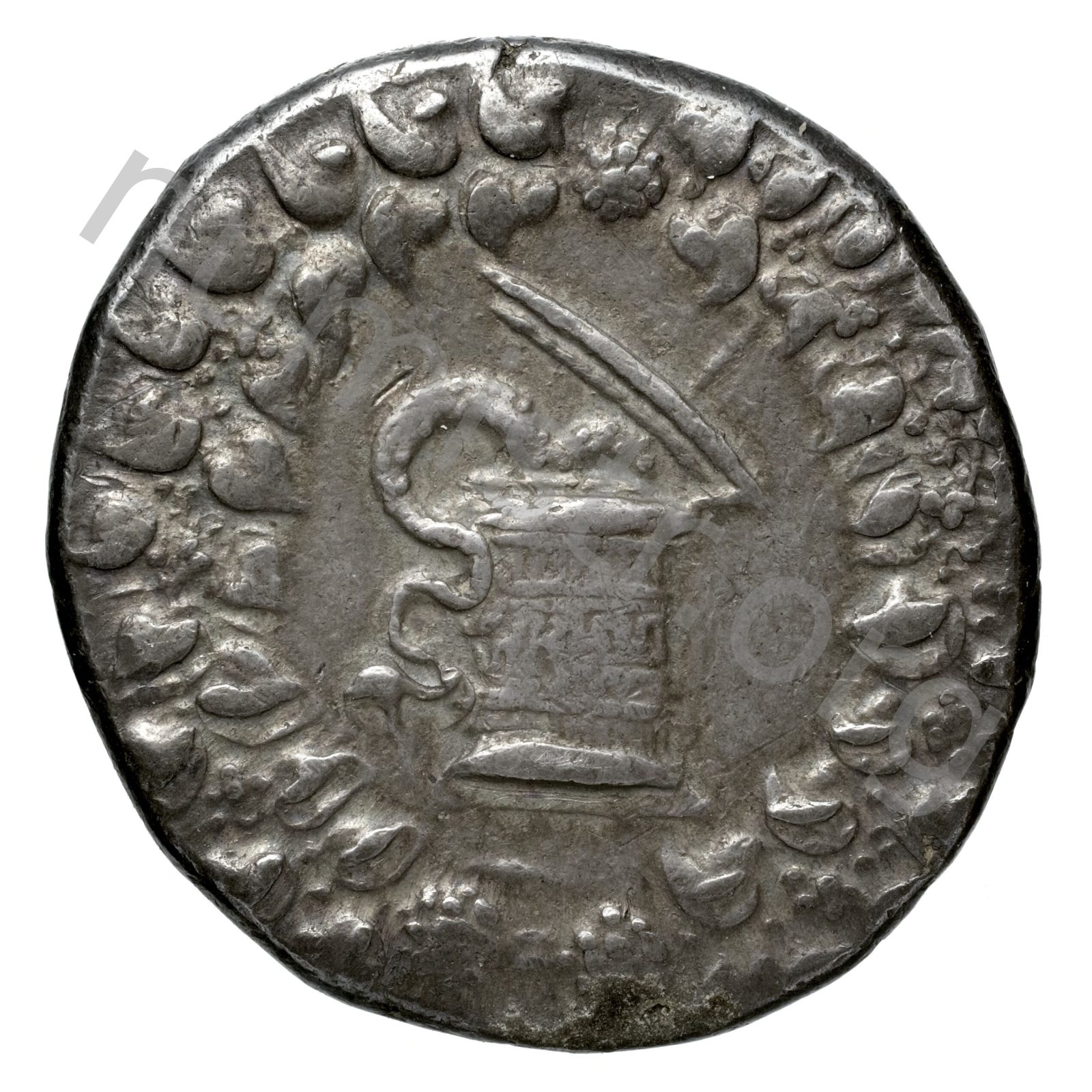 Gorytos (bow case) decorated with an aplustre and containing a bow between two intertwined snakes; to side Zeus -[en]