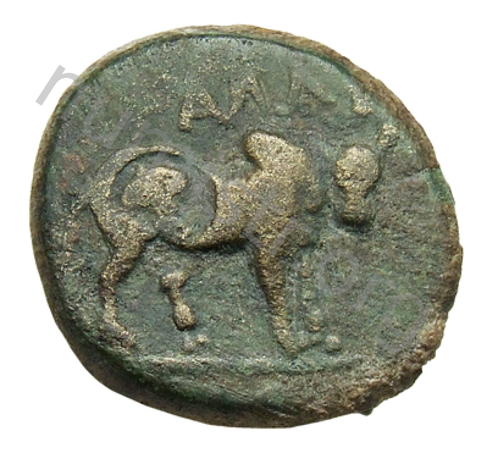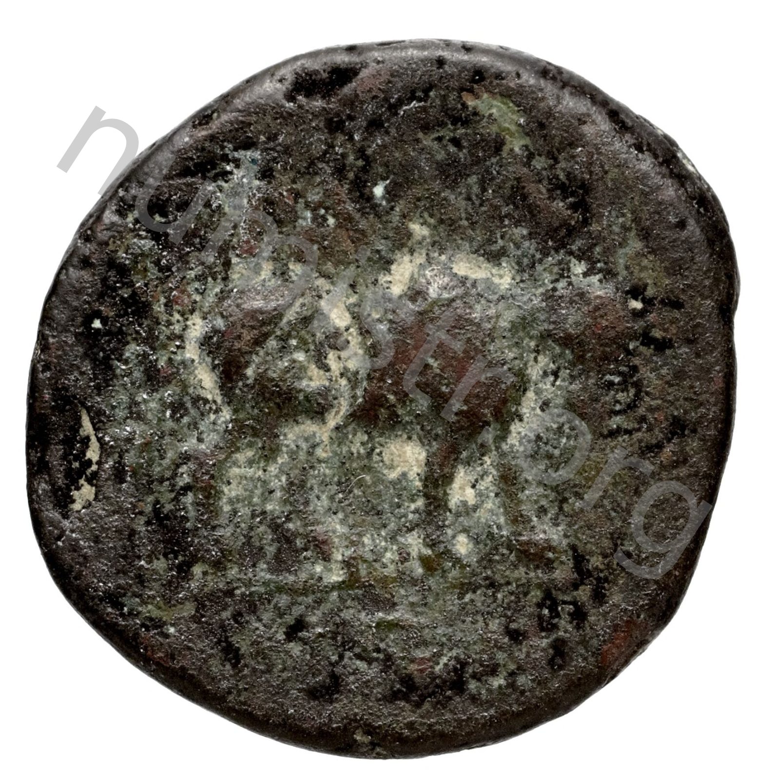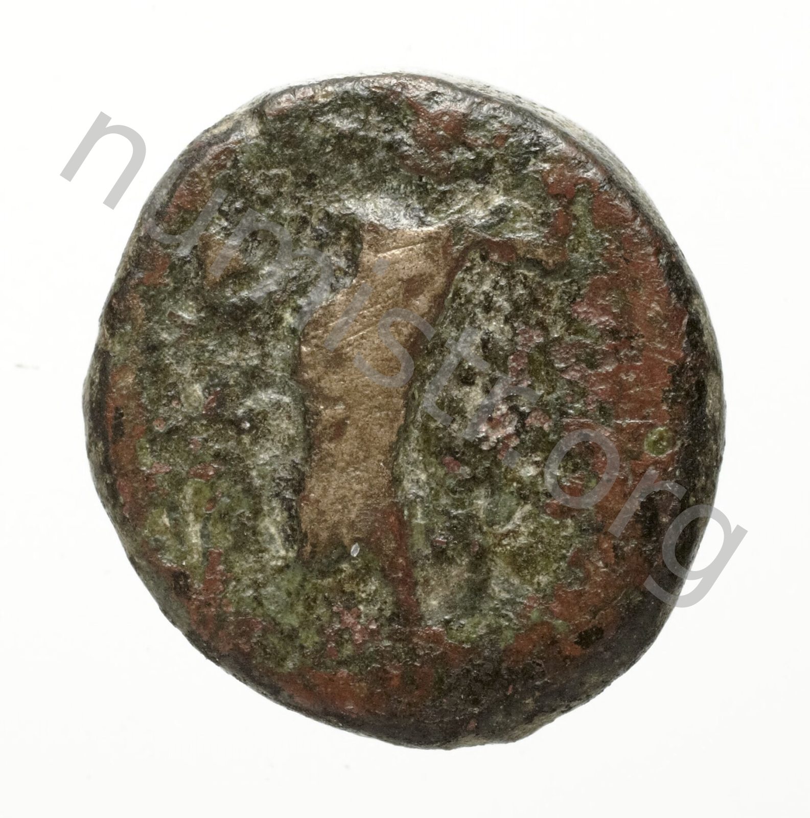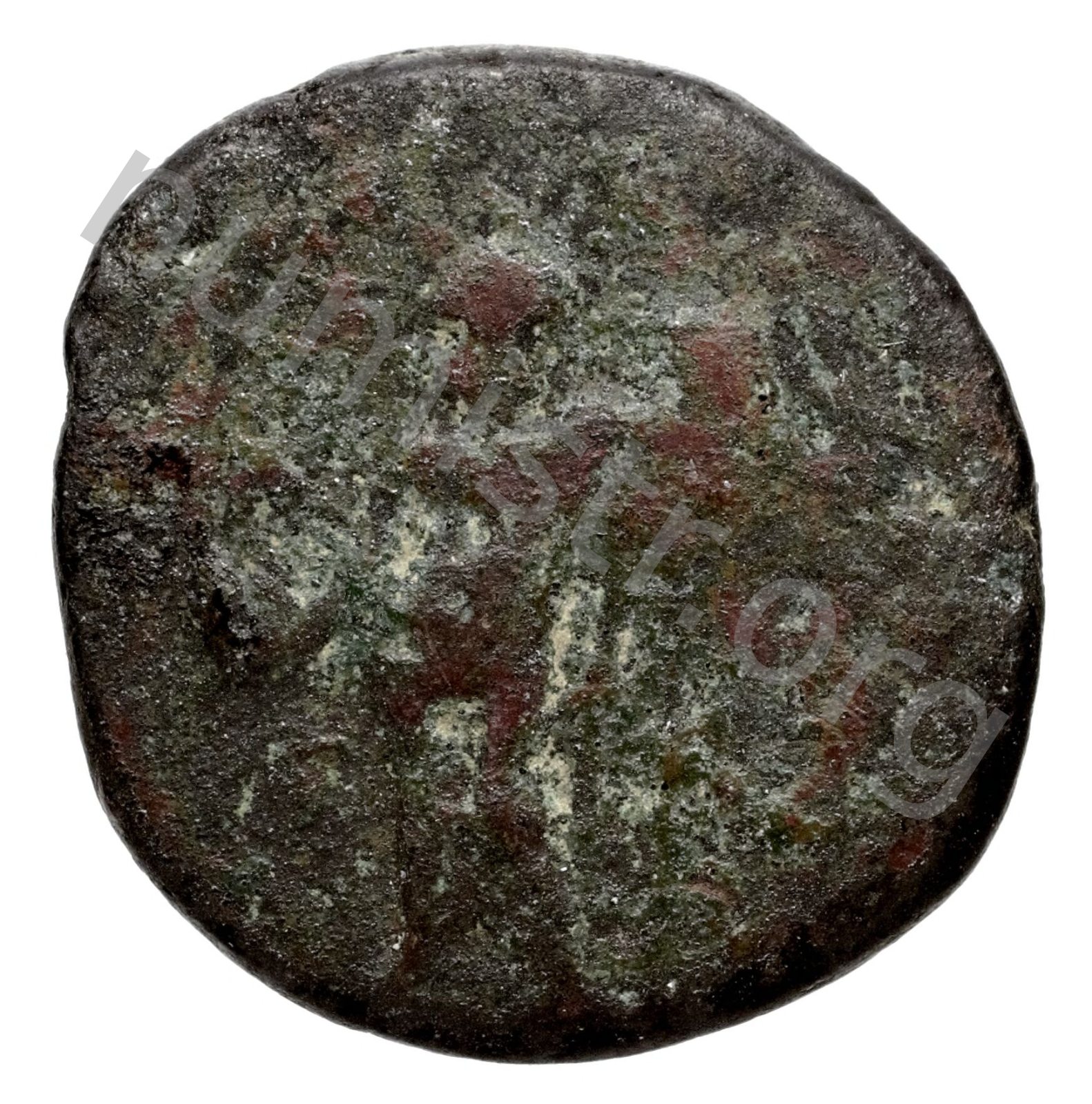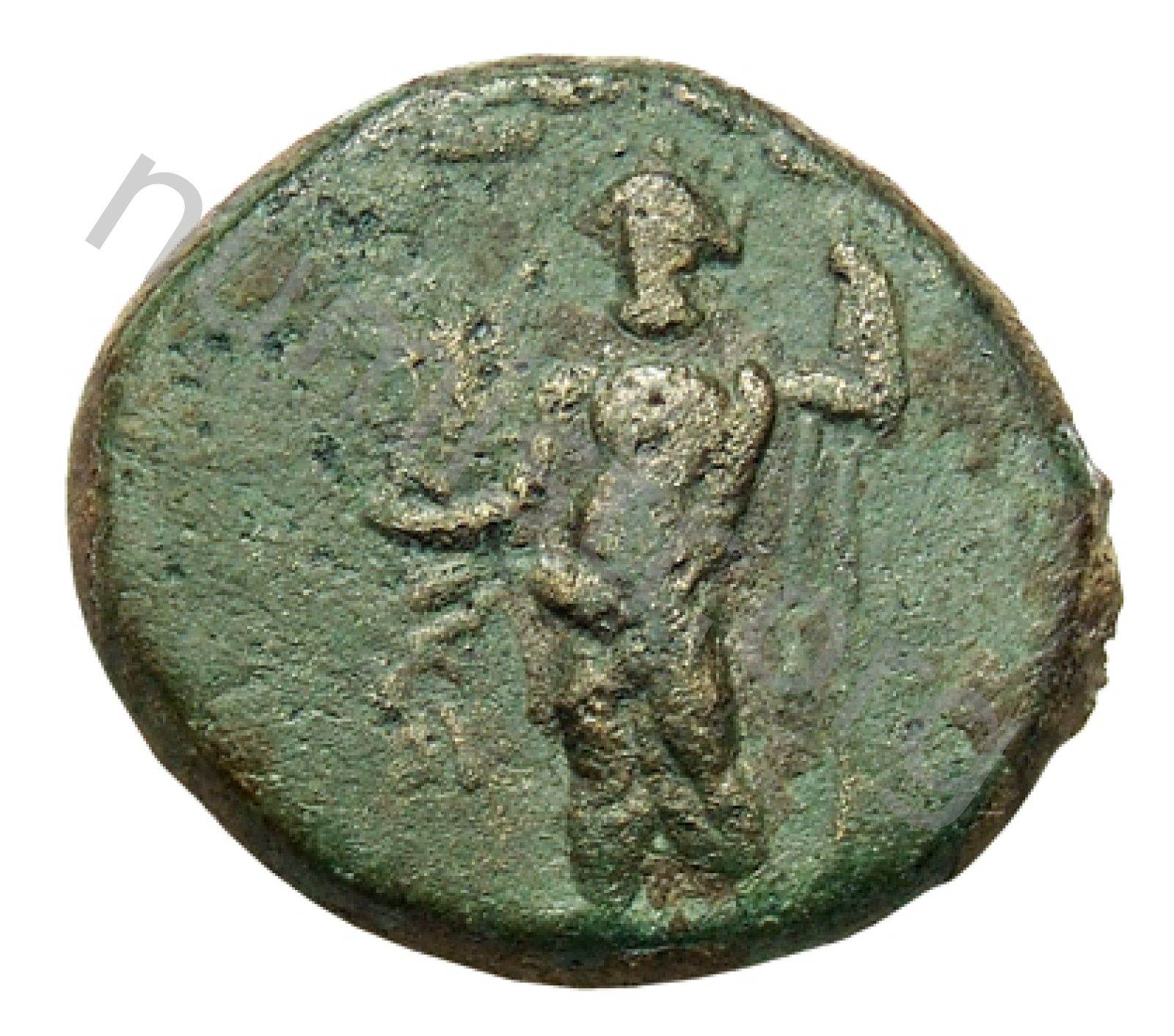 Himation (pelerin) giymiş elinde Nike ve bir asa tutan defne çelengi takmış Zeus'un yüzü