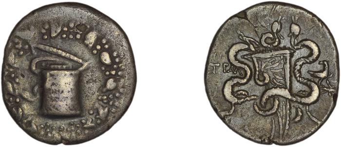 Gorytos (yay kılıfı) bir aplustre ile süslenmiş ve iki iç içe geçmiş yılan arasında bir yay içeren; yıldırım üzerinde kartalın yan tarafına