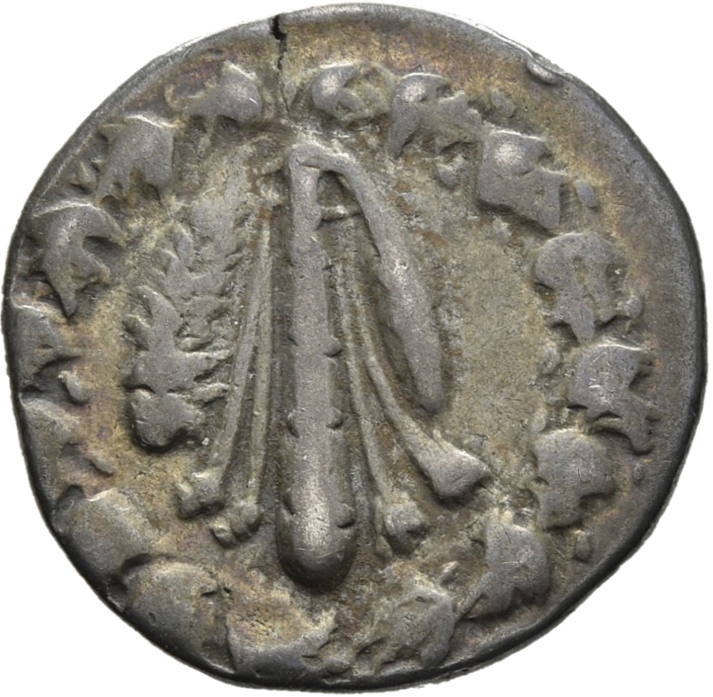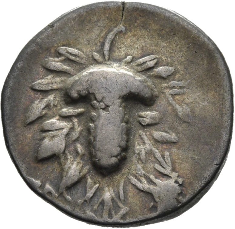 Bunch of grapes and vine leaf; head of Zeus -[en]