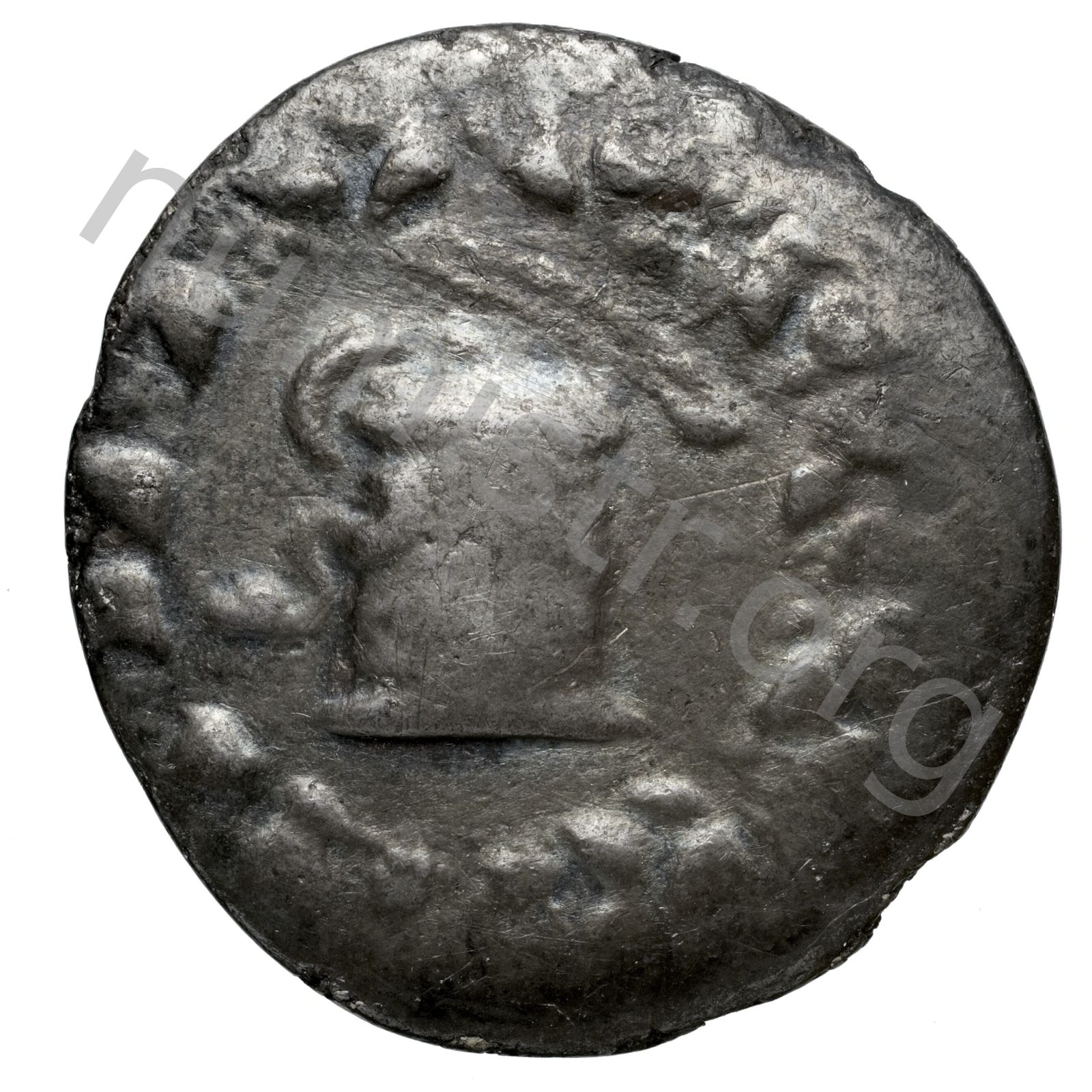 Gorytos (yay kılıfı) bir aplustre ile süslenmiş ve iki iç içe geçmiş yılan arasında bir yay bulunduruyor; şimşek işaretinin üstünde yan miğfer