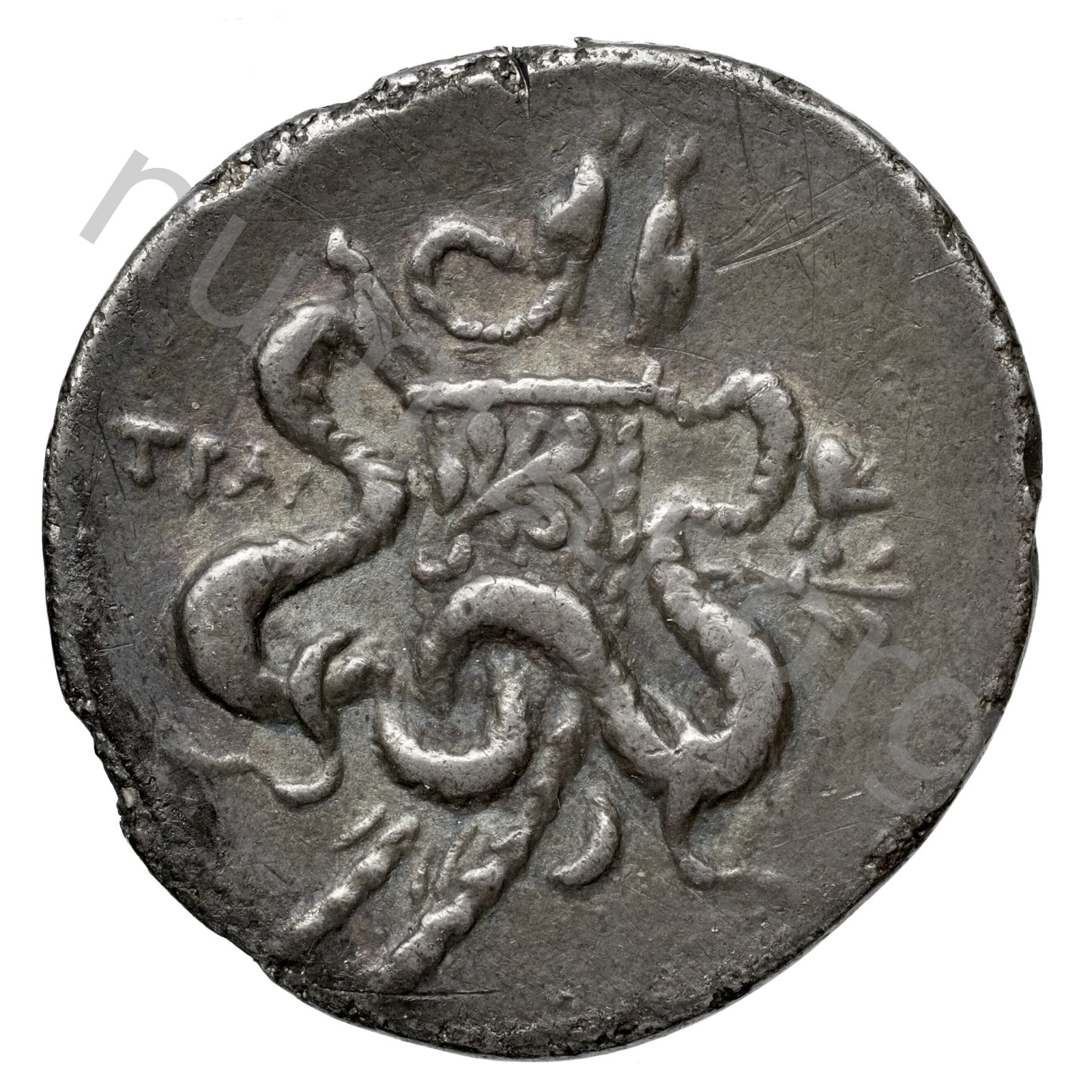 Gorytos (bow case) decorated with an aplustre and containing a bow between two intertwined snakes; to side helmet above thunderbolt -[en]