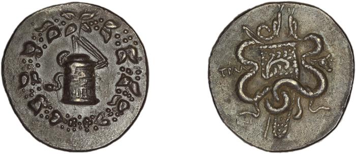 Basket (cista mystica) from which a snake emerges in a wreath of ivy -[en]