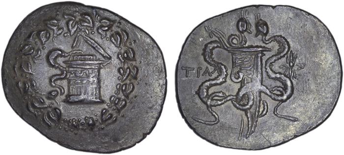 Gorytos (yay kılıfı) bir artı işaretiyle süslenmiş ve iki iç içe geçmiş yılan arasında bir yay bulunan; yan tarafında şimşek bulunan