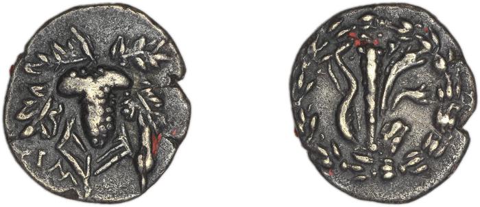 Bunch of grapes and vine leaf; corn-ear -[en]