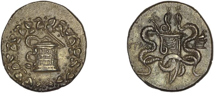 Gorytos (yay kılıfı) bir aplustre ile süslenmiş ve iki iç içe geçmiş yılan arasında bir yay içeren; pruvada kartal bulunan