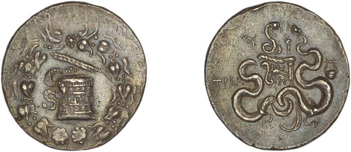 Gorytos (yay kılıfı) bir aplustre ile süslenmiş ve iki iç içe geçmiş yılan arasında bir yay içeriyor; meşalenin üstünde; lirin yanında