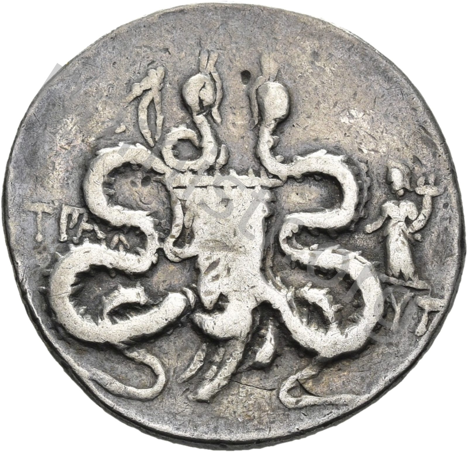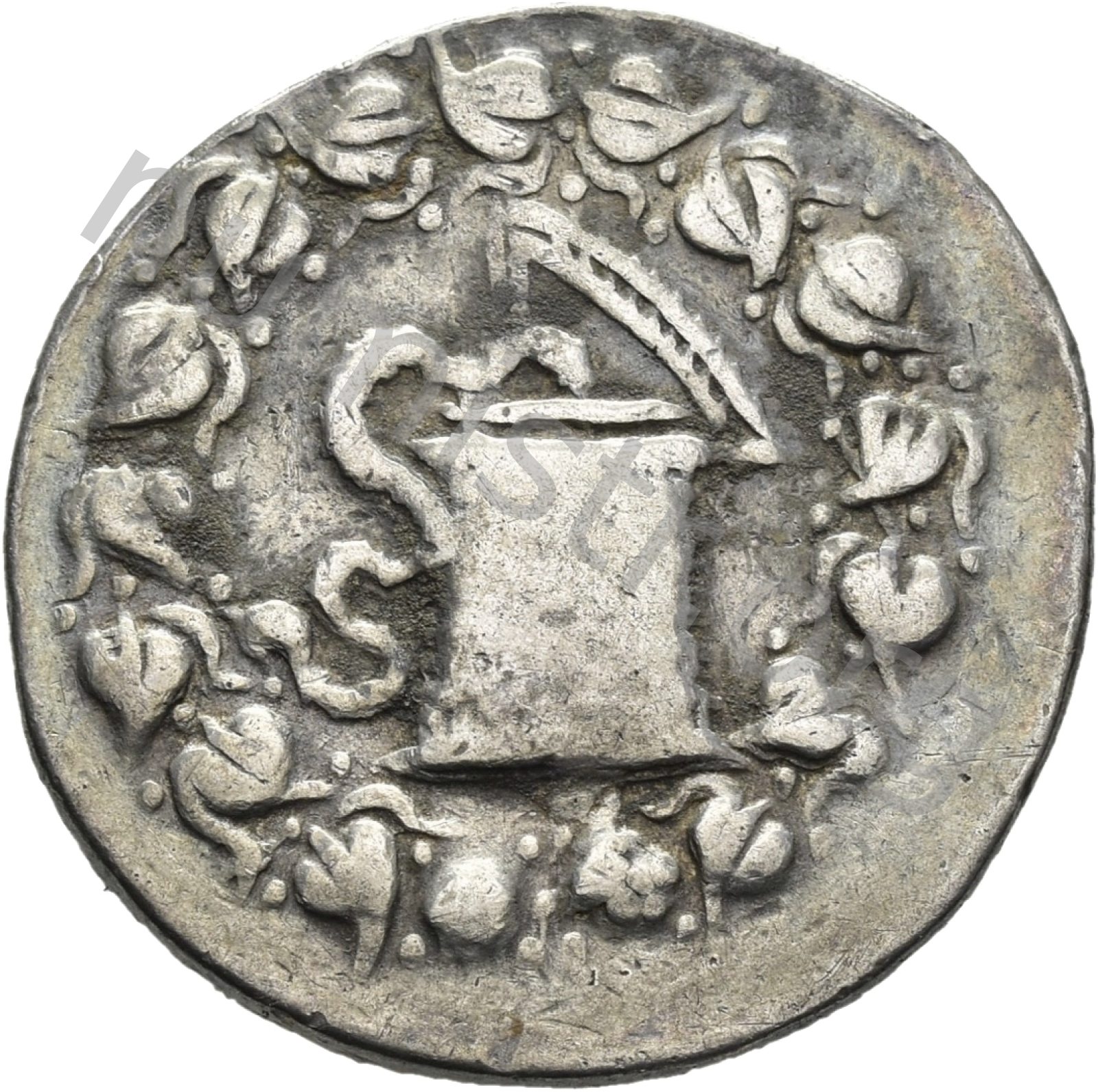 Gorytos (bow case) decorated with an aplustre and containing a bow between two intertwined snakes; to side Tyche -[en]