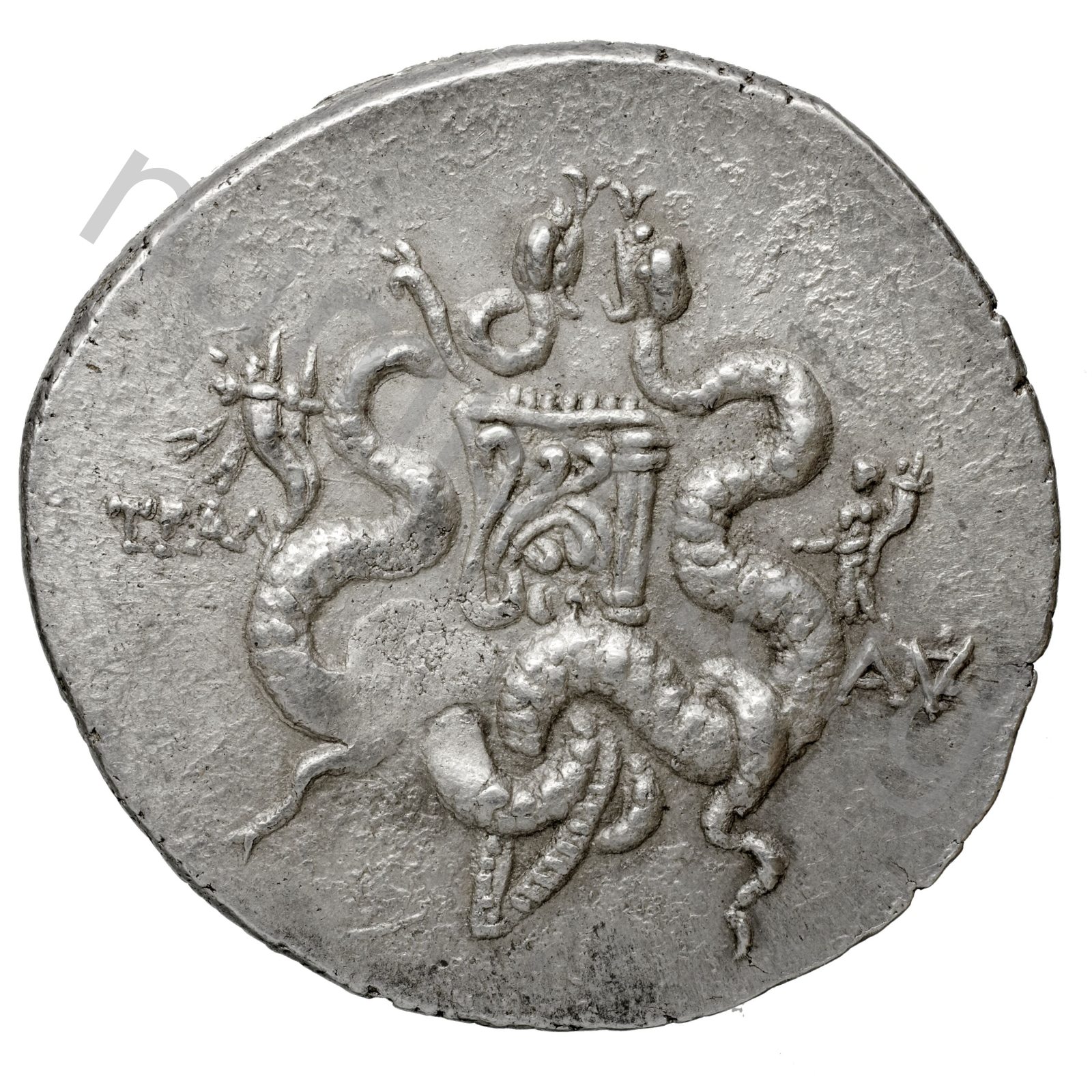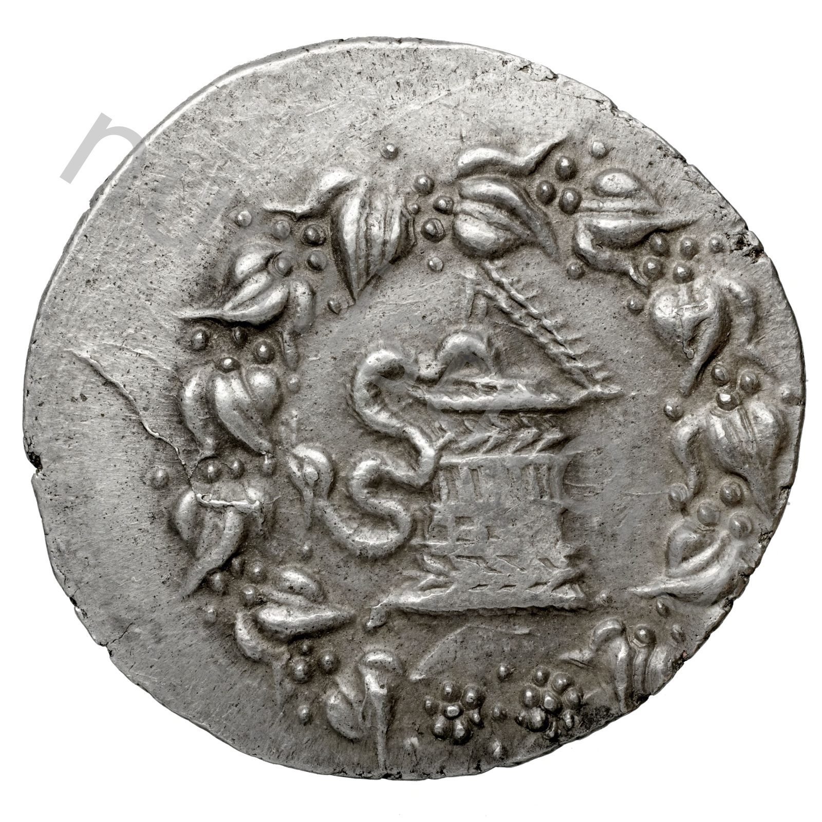 Gorytos (yay kılıfı) bir aplustre ile süslenmiş ve iki iç içe geçmiş yılan arasında bir yay içeriyor; yanlarda çift bereket boynuzu ve Tyche