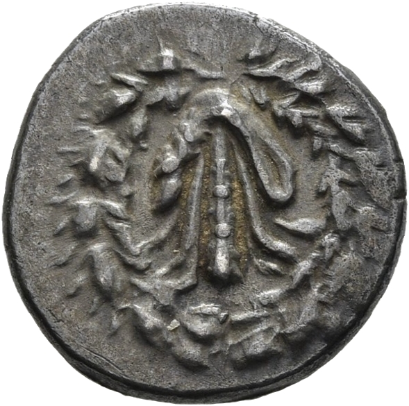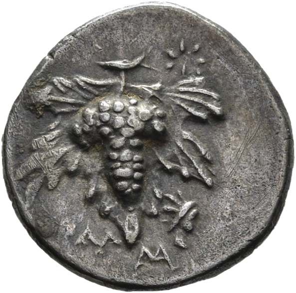 Bunch of grapes and vine leaf; star and head of Helios -[en]