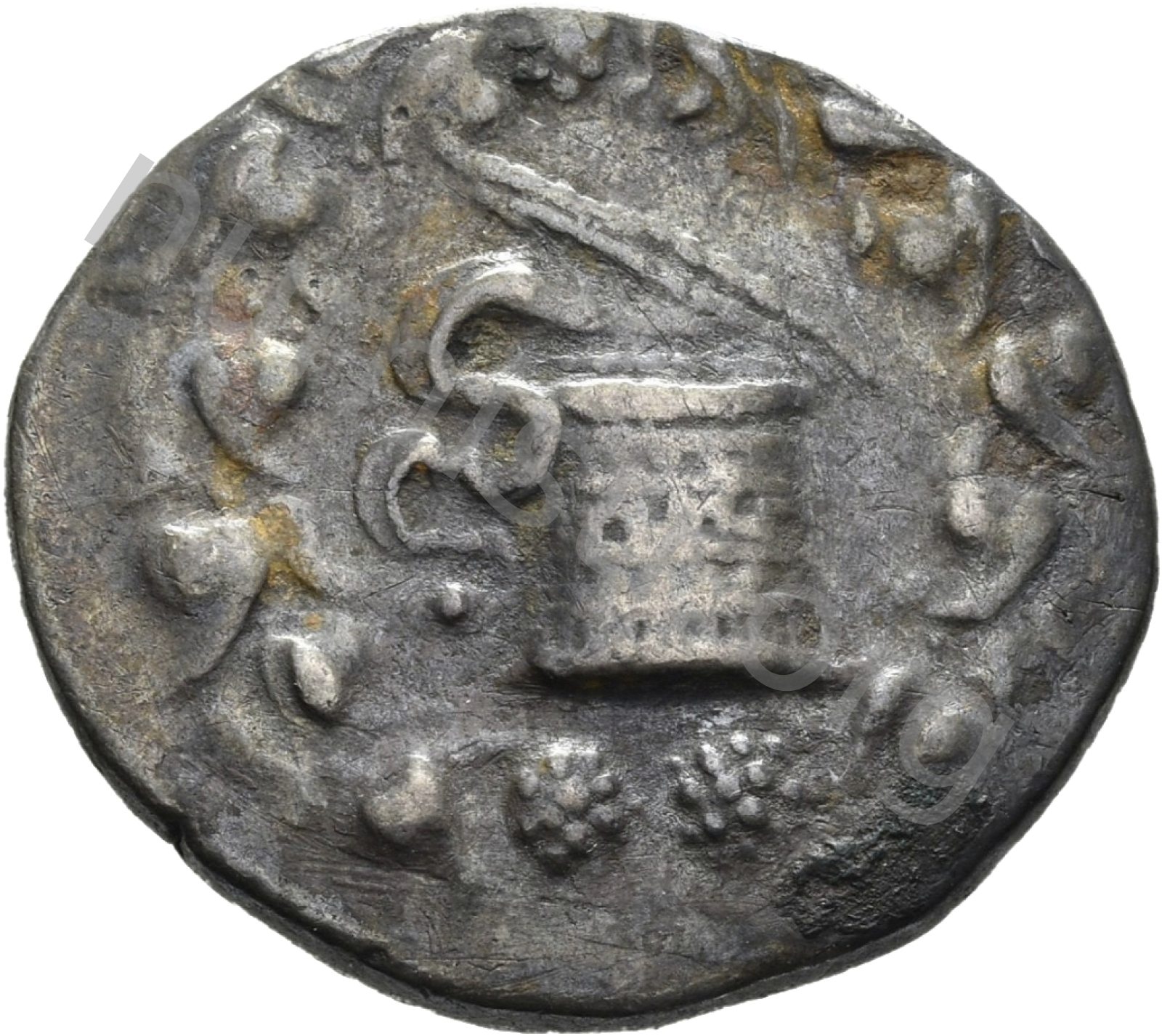 Basket (cista mystica) from which a snake emerges in a wreath of ivy -[en]