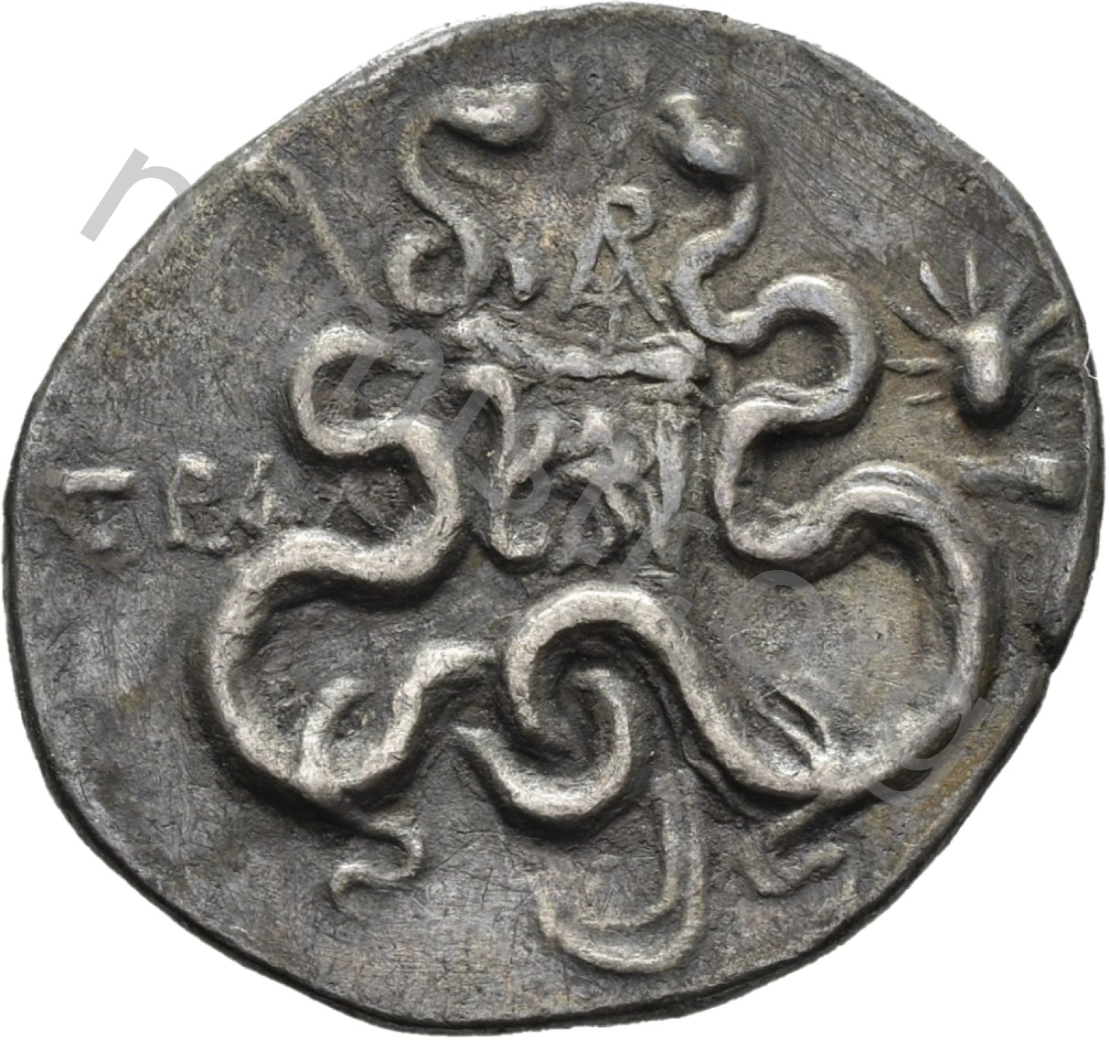 Gorytos (yay kılıfı) bir artı işareti ile süslenmiş ve iki iç içe geçmiş yılan arasında bir yay içeren; Helios'un büstünün yan tarafına bakan