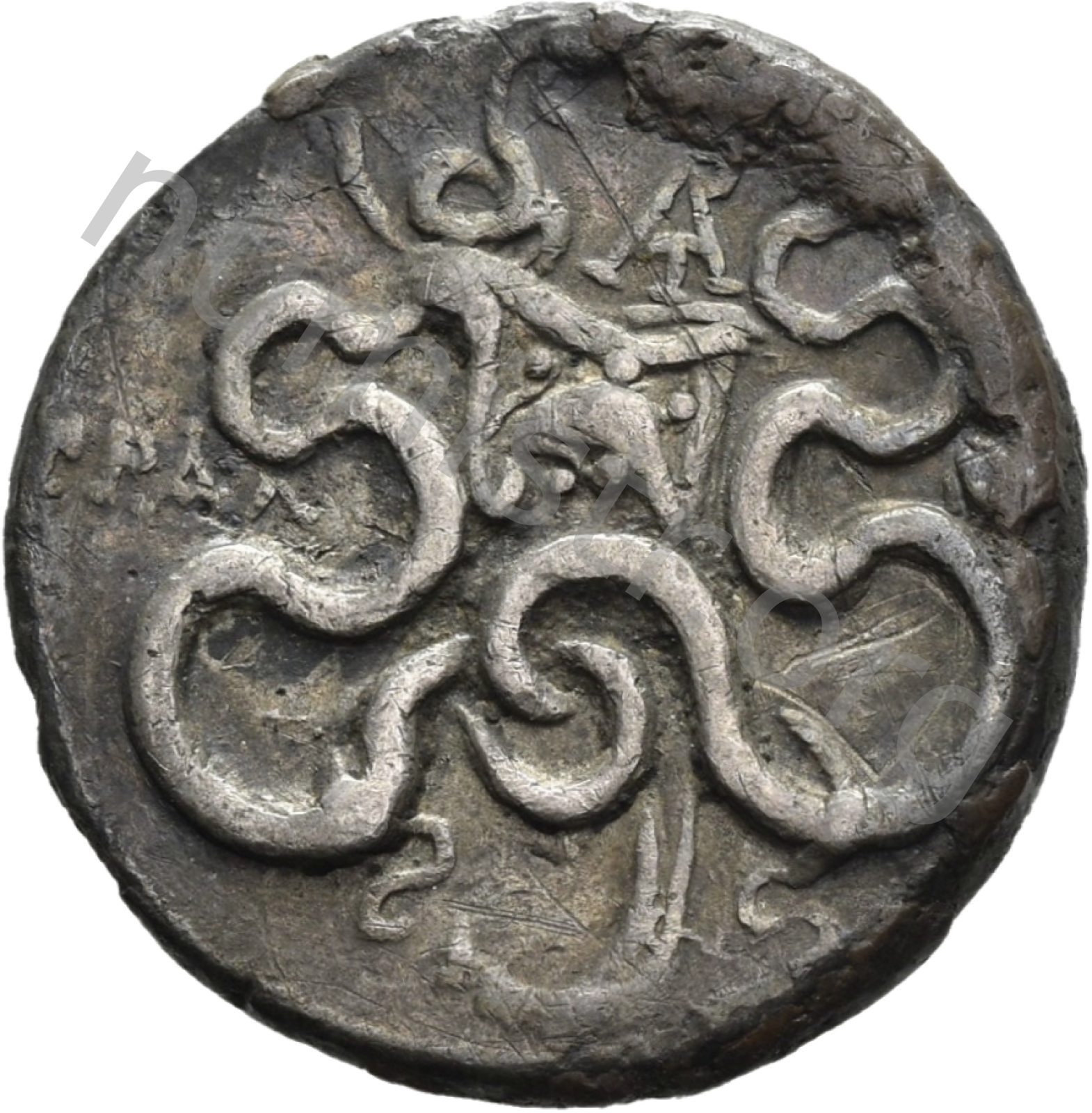 Gorytos (bow case) decorated with an aplustre and containing a bow between two intertwined snakes; to side poppy-head and corn-ear -[en]