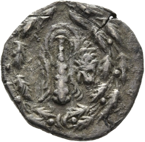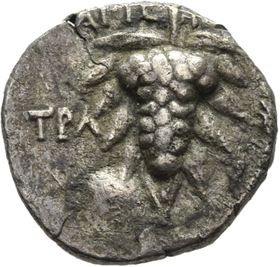 Grape bunch on a field of oak leaves; bust of Athena -[en]
