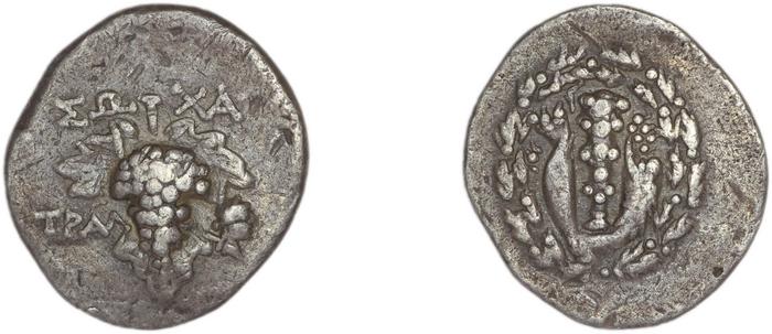Grape bunch on a field of oak leaves; bust of Artemis -[en]