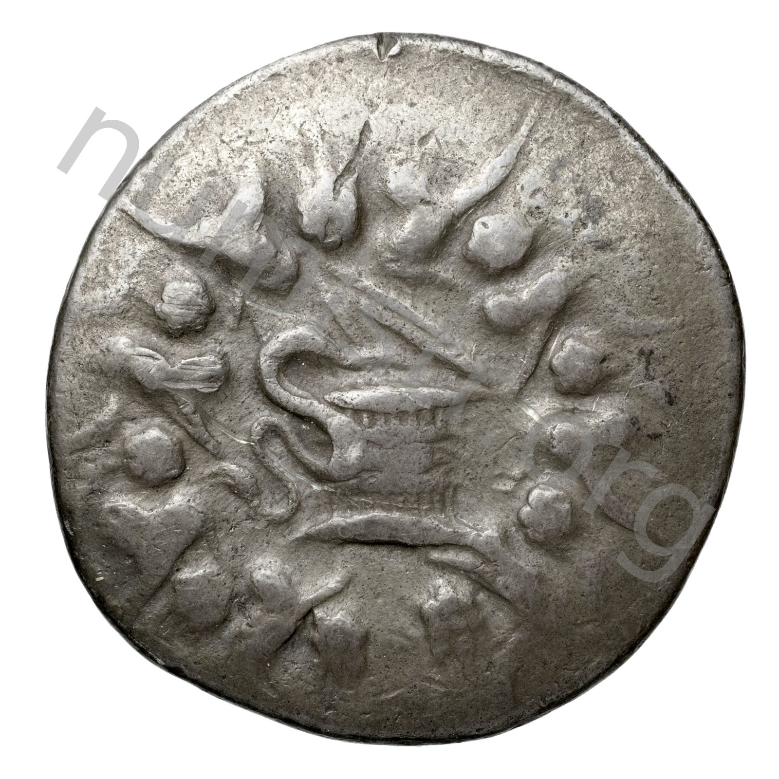 Gorytos (yay kılıfı) bir artı işaretiyle süslenmiş ve iki iç içe geçmiş yılan arasında bir yay bulunan; yan tarafta haşhaş başlı ve mısır koçanı bulunan