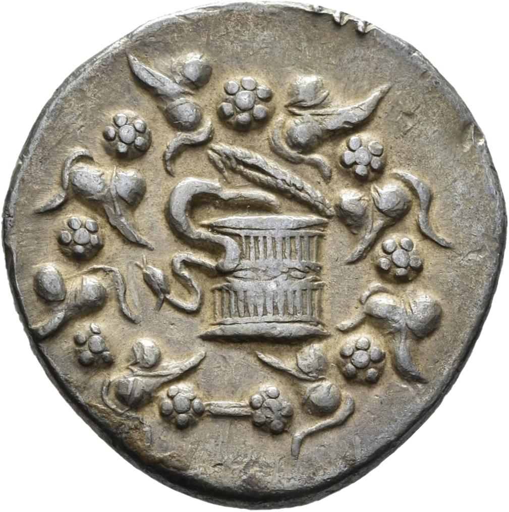 Gorytos (yay kılıfı) bir artı işaretiyle süslenmiş ve iki iç içe geçmiş yılan arasında bir yay bulunan; yan tarafta haşhaş başlı ve mısır koçanı bulunan