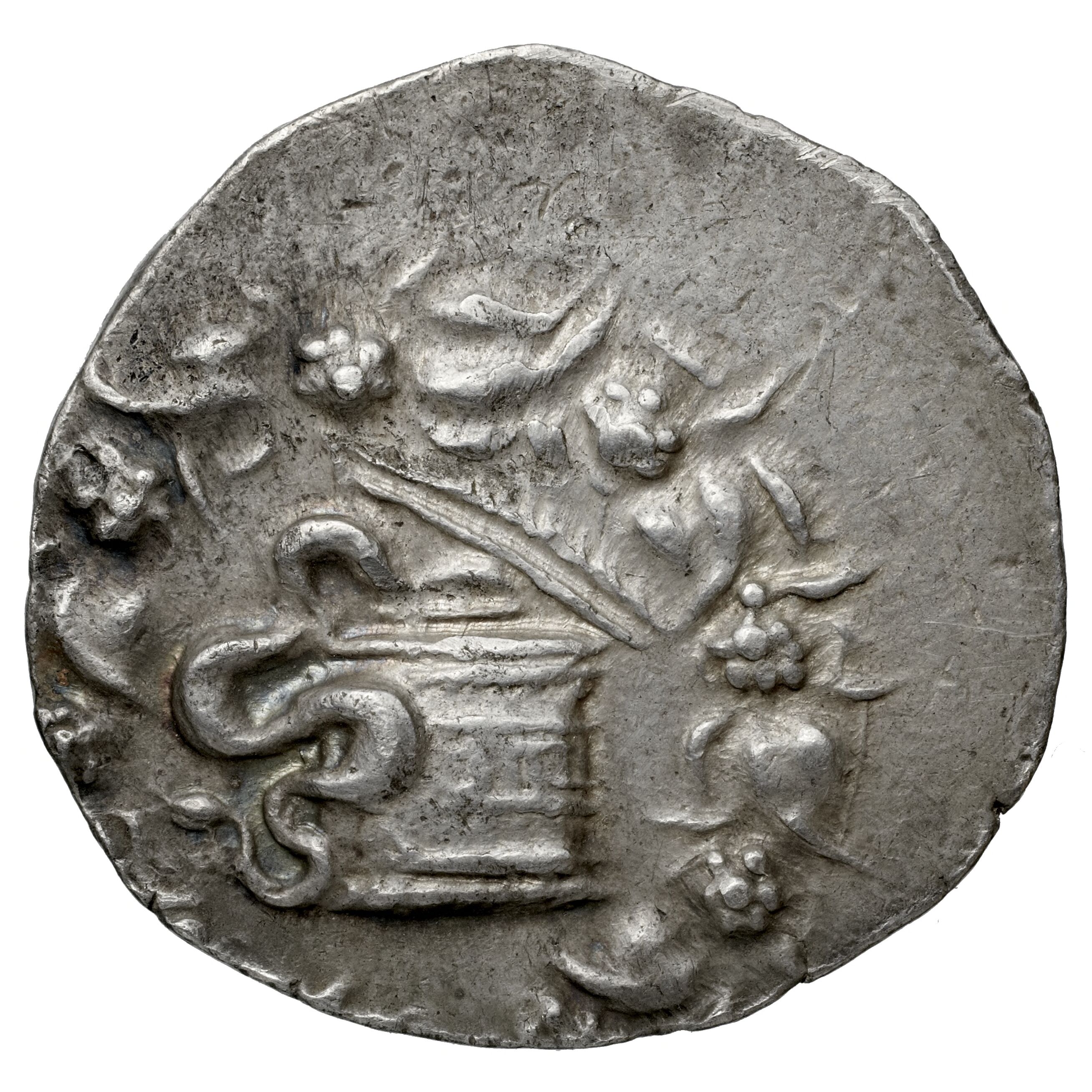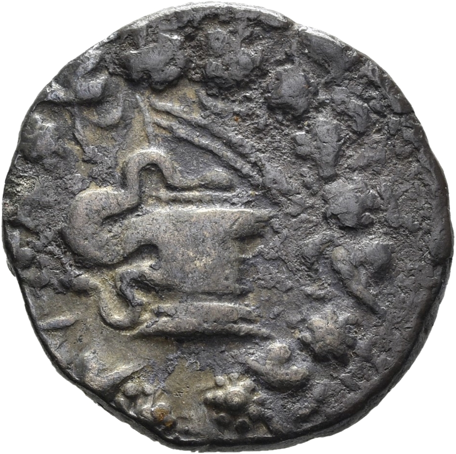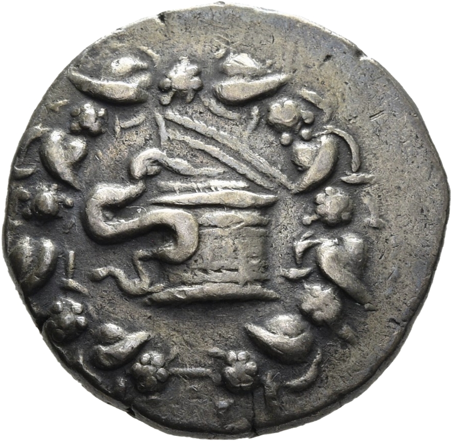 Basket (cista mystica) from which a snake emerges in a wreath of ivy -[en]