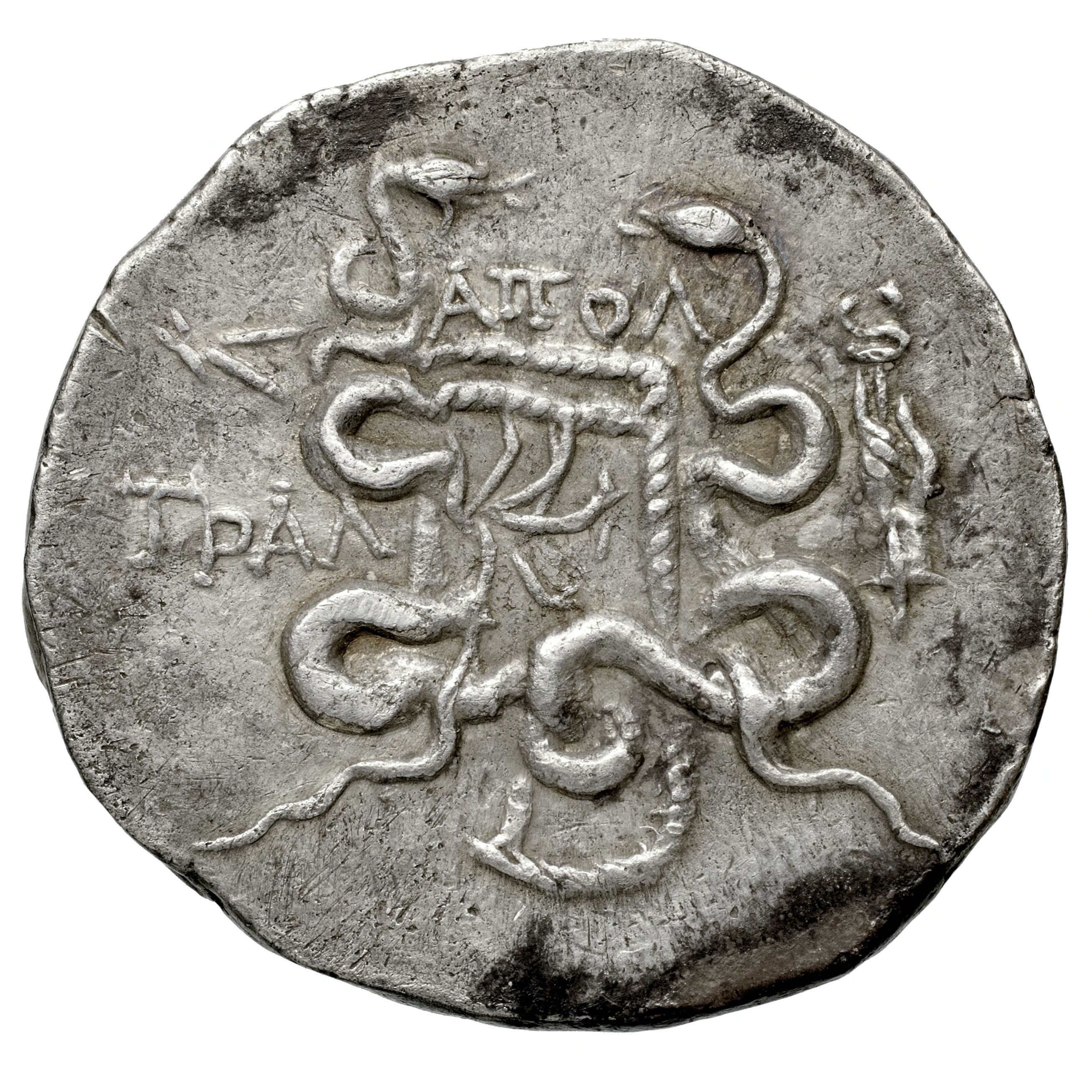 Gorytos (yay kılıfı) bir artı işaretiyle süslenmiş ve iki iç içe geçmiş yılan arasında bir yay bulunan; yan tarafta haşhaş başlı ve mısır koçanı bulunan