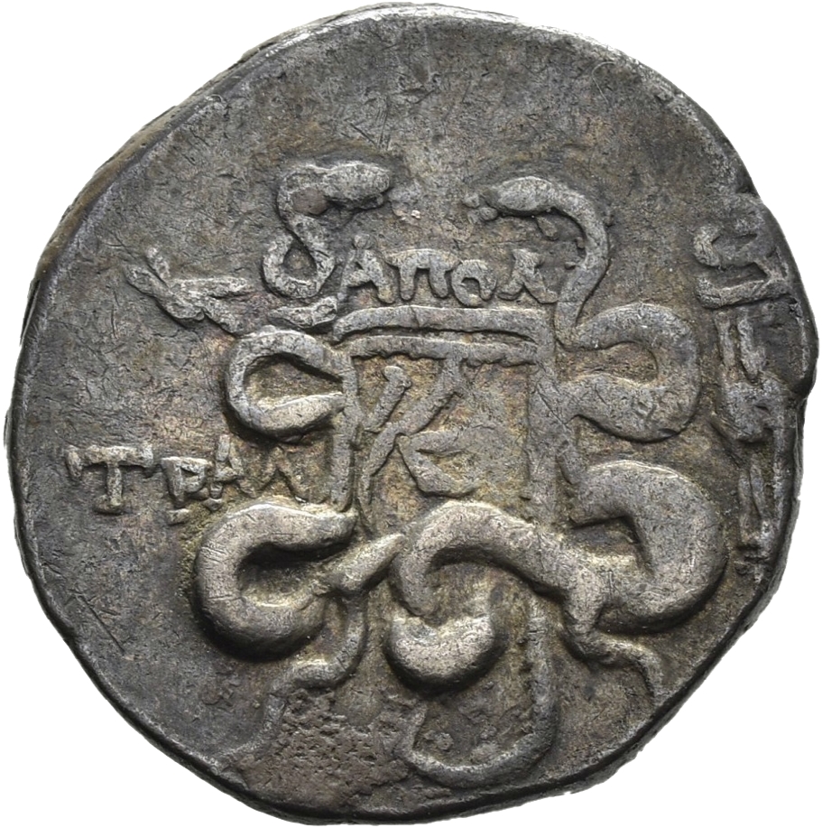 Gorytos (bow case) decorated with an aplustre and containing a bow between two intertwined snakes; to side poppy-head and corn-ear -[en]