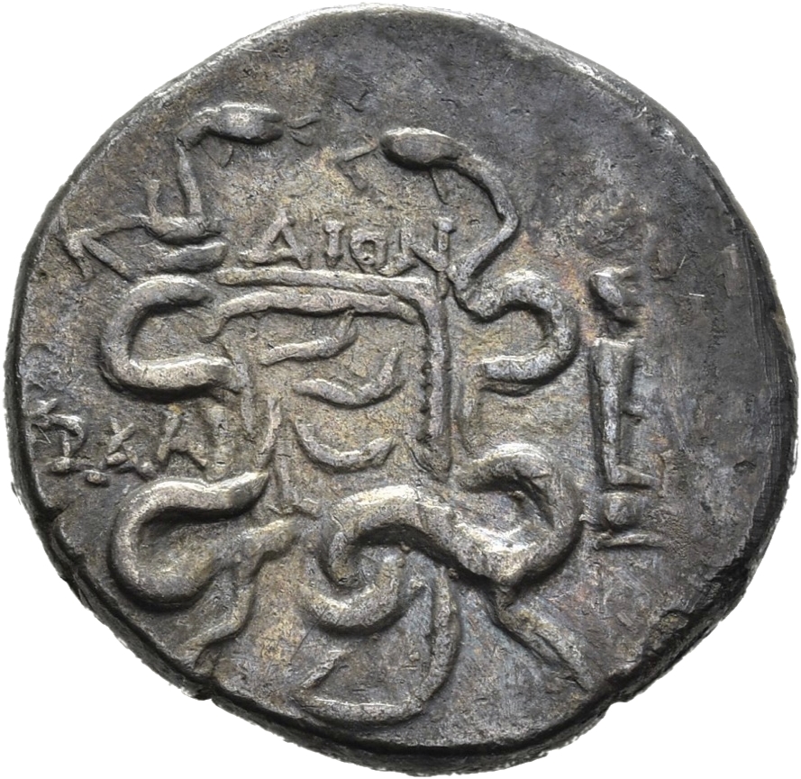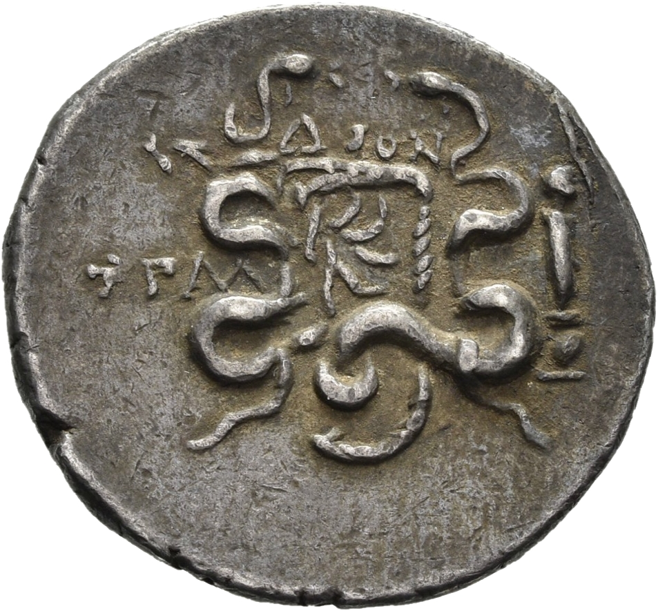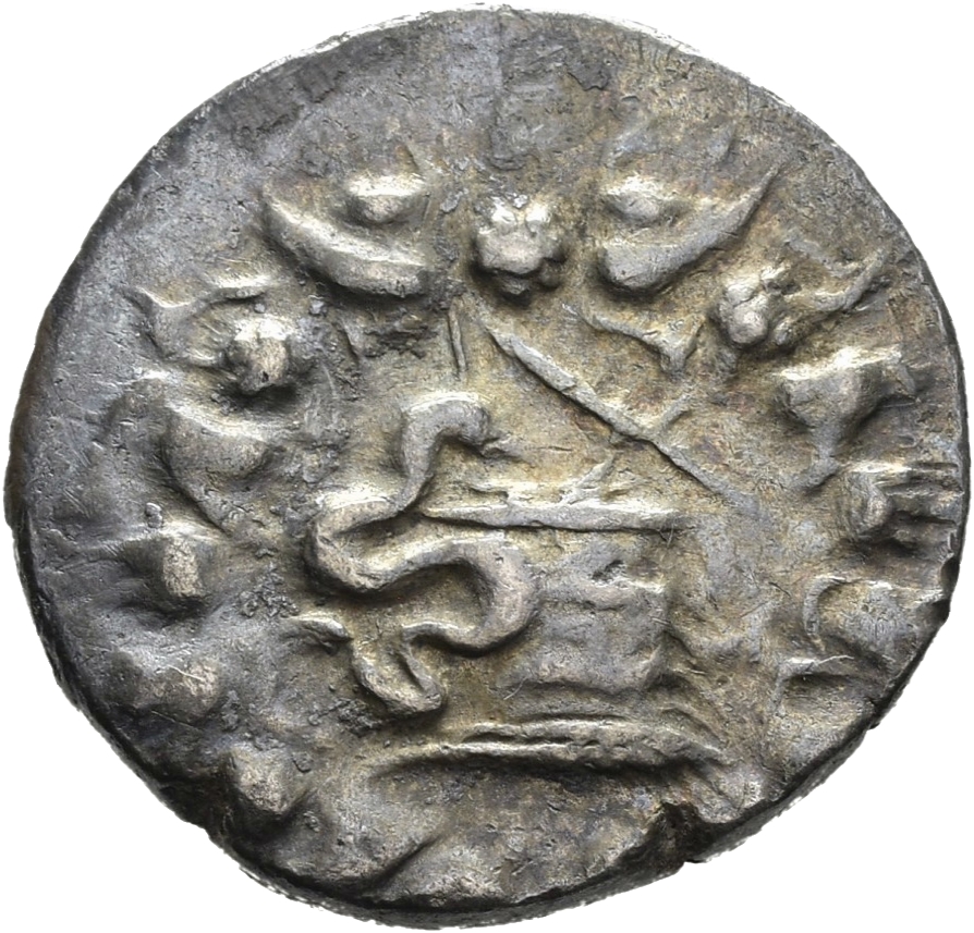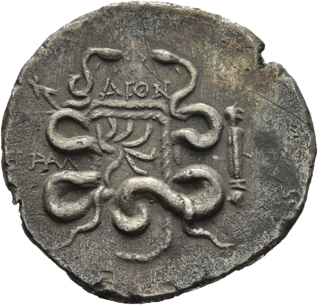 Gorytos (yay kılıfı) bir artı işaretiyle süslenmiş ve iki iç içe geçmiş yılan arasında bir yay bulunan; yan tarafta haşhaş başlı ve mısır koçanı bulunan
