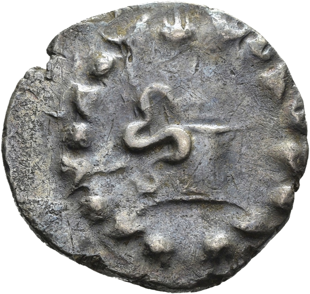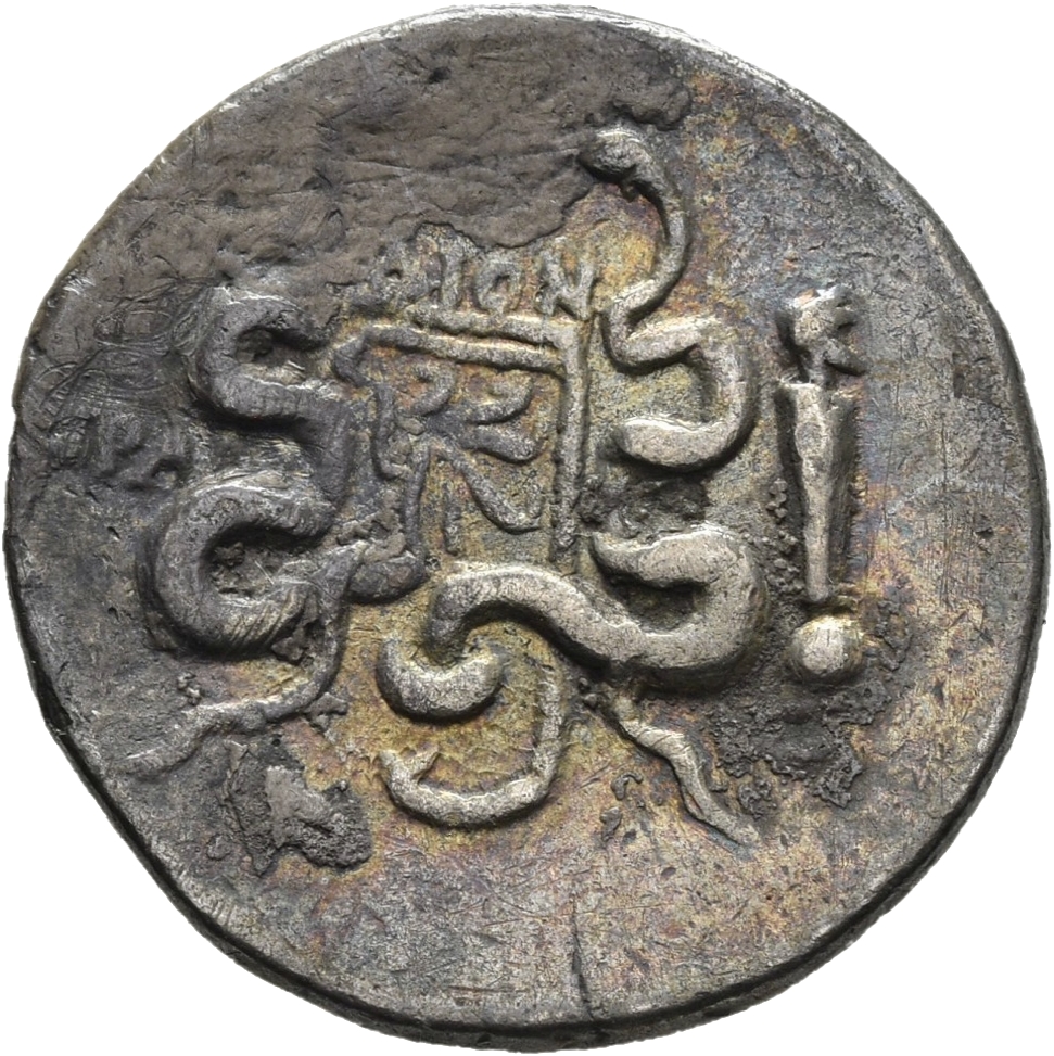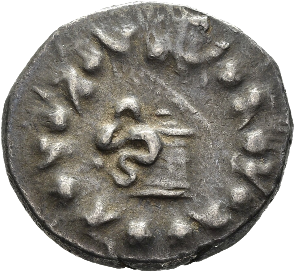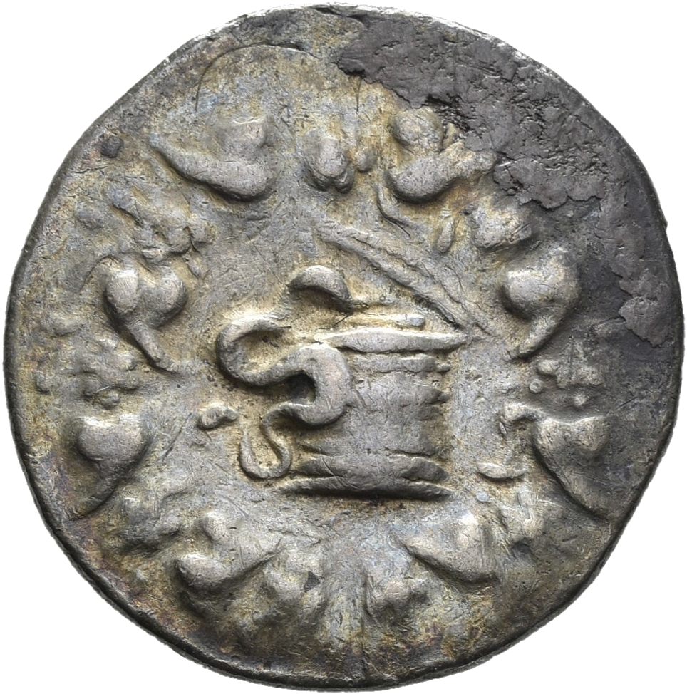 Gorytos (bow case) decorated with an aplustre and containing a bow between two intertwined snakes; to side poppy-head and corn-ear -[en]