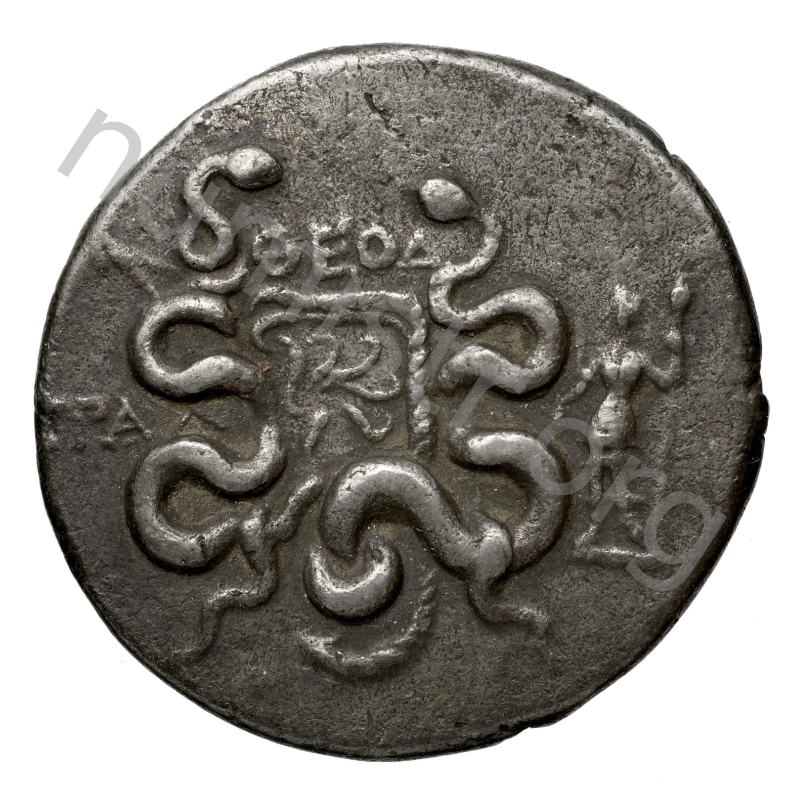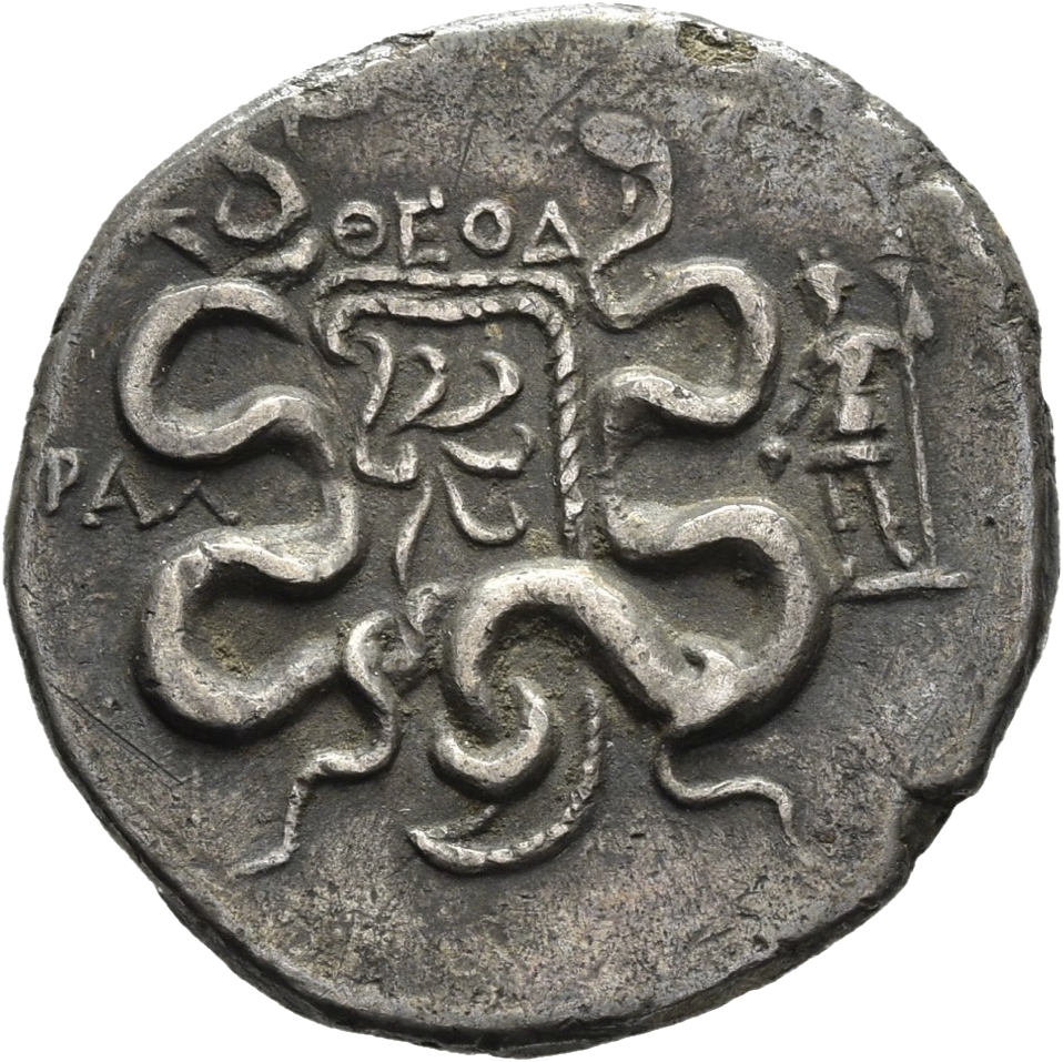 Gorytos (yay kılıfı) bir artı işaretiyle süslenmiş ve iki iç içe geçmiş yılan arasında bir yay bulunan; yan tarafta haşhaş başlı ve mısır koçanı bulunan