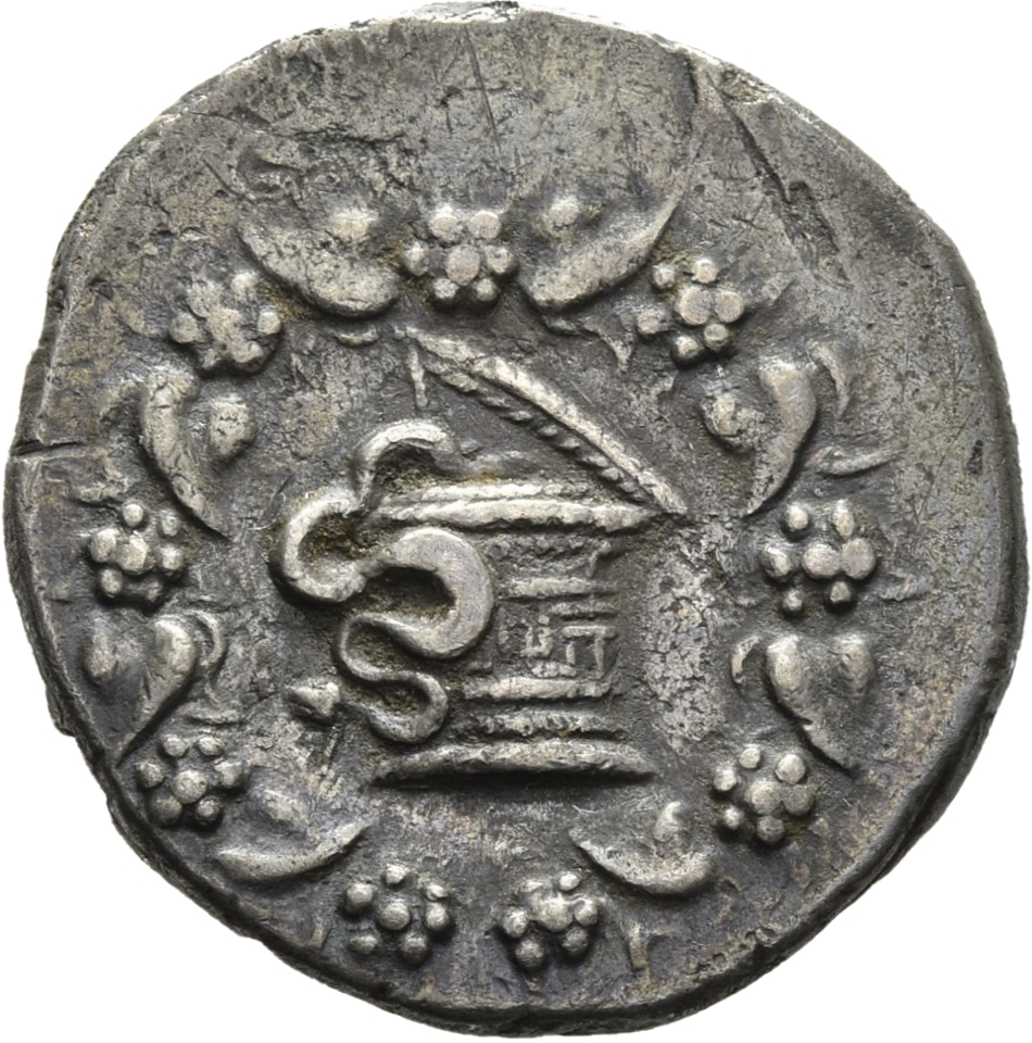 Basket (cista mystica) from which a snake emerges in a wreath of ivy -[en]
