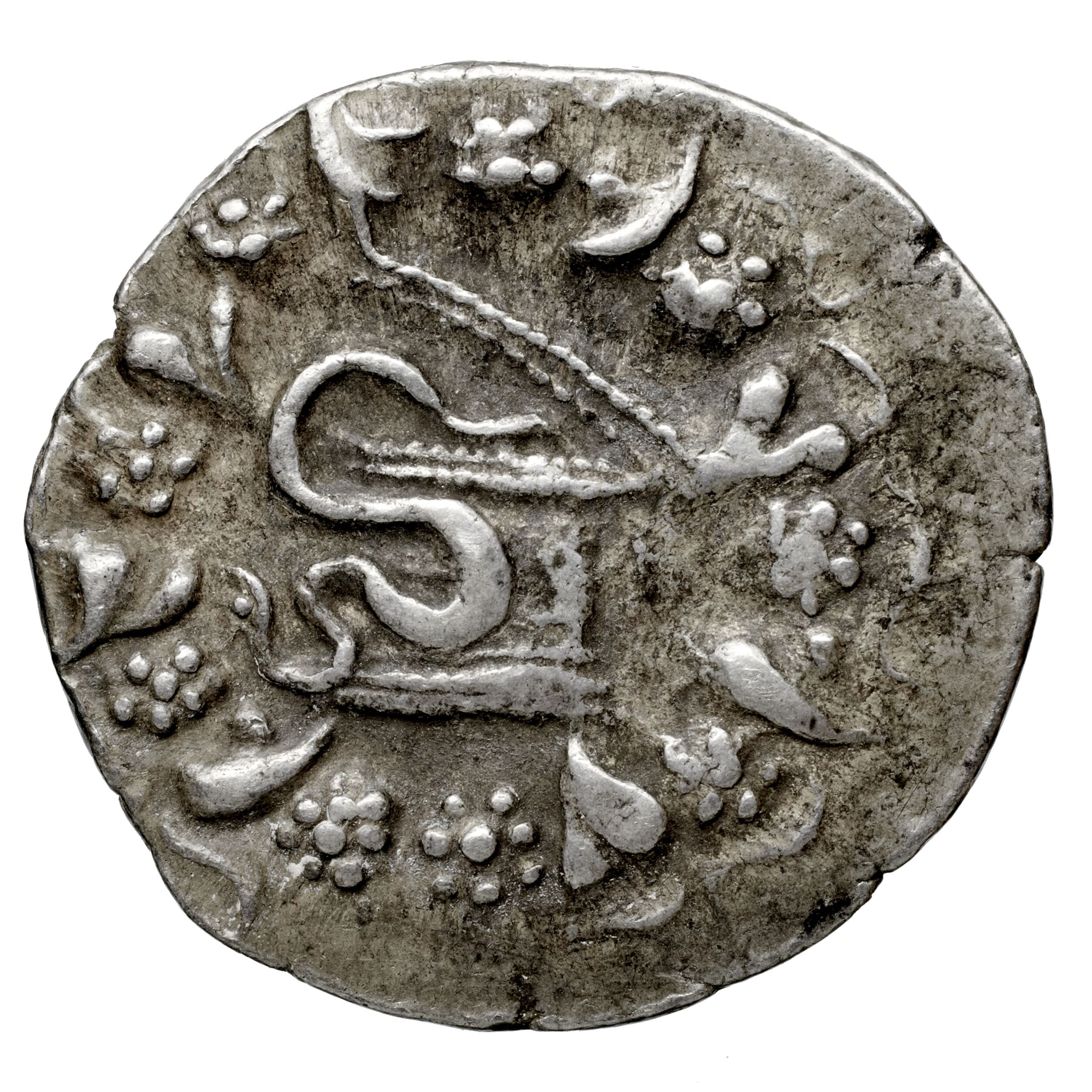 Gorytos (bow case) decorated with an aplustre and containing a bow between two intertwined snakes; to side poppy-head and corn-ear -[en]