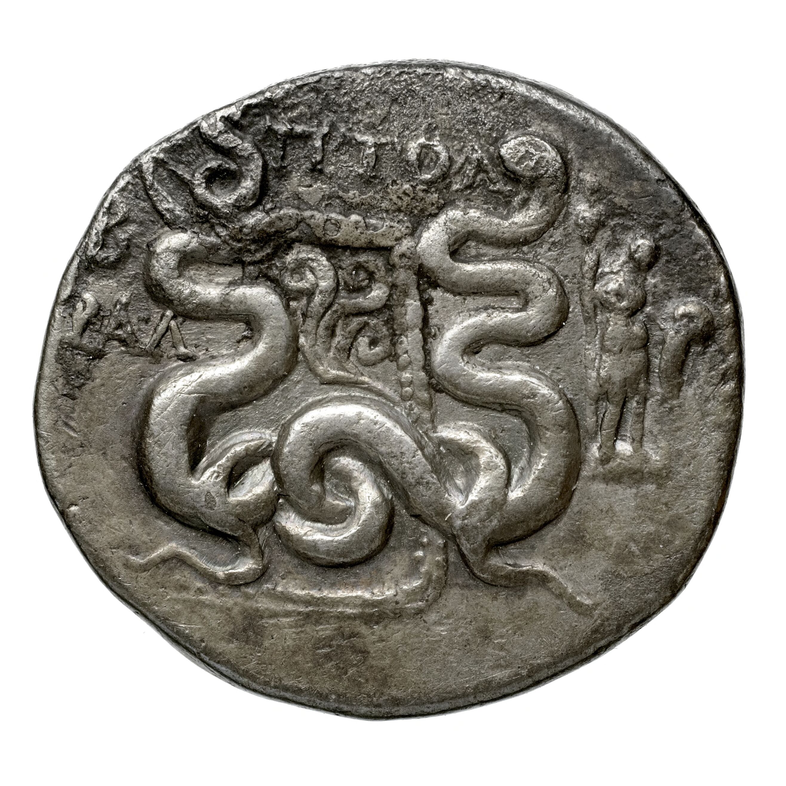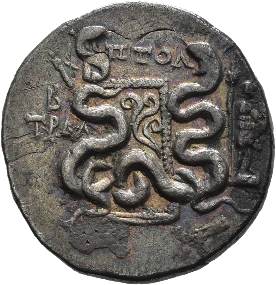 Gorytos (yay kılıfı) bir artı işaretiyle süslenmiş ve iki iç içe geçmiş yılan arasında bir yay bulunan; yan tarafta haşhaş başlı ve mısır koçanı bulunan