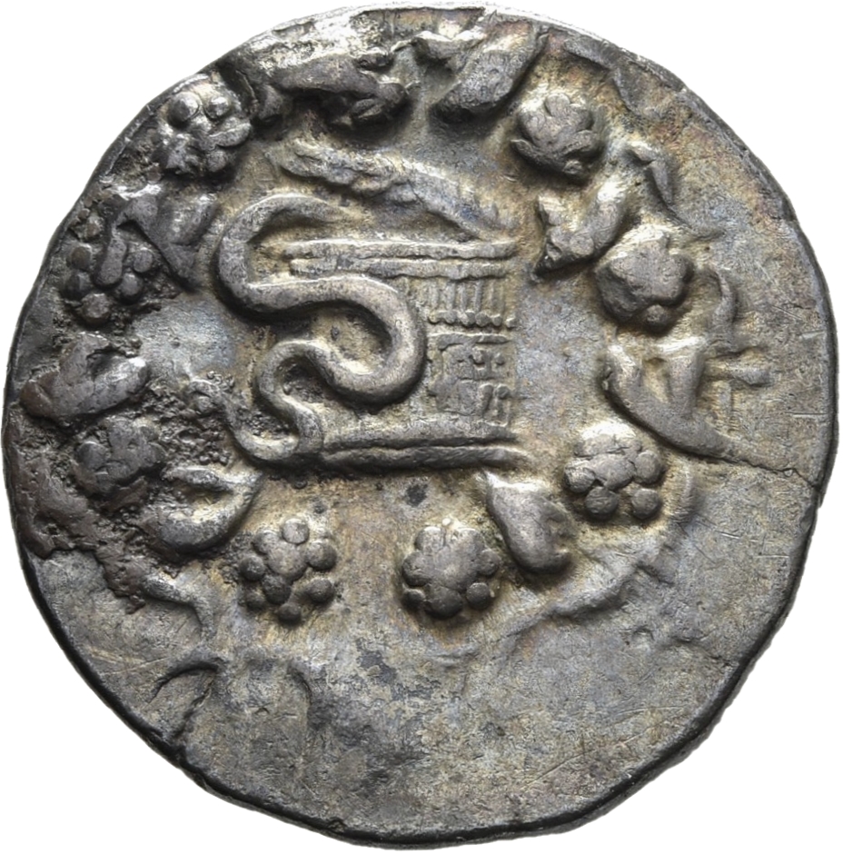 Basket (cista mystica) from which a snake emerges in a wreath of ivy -[en]