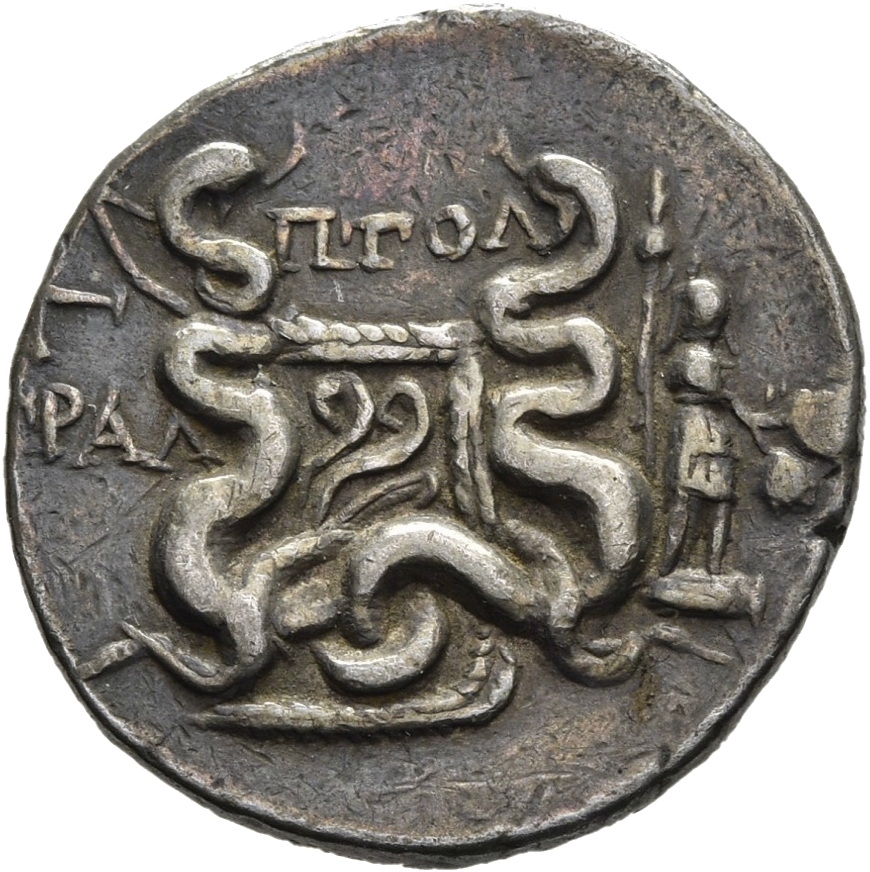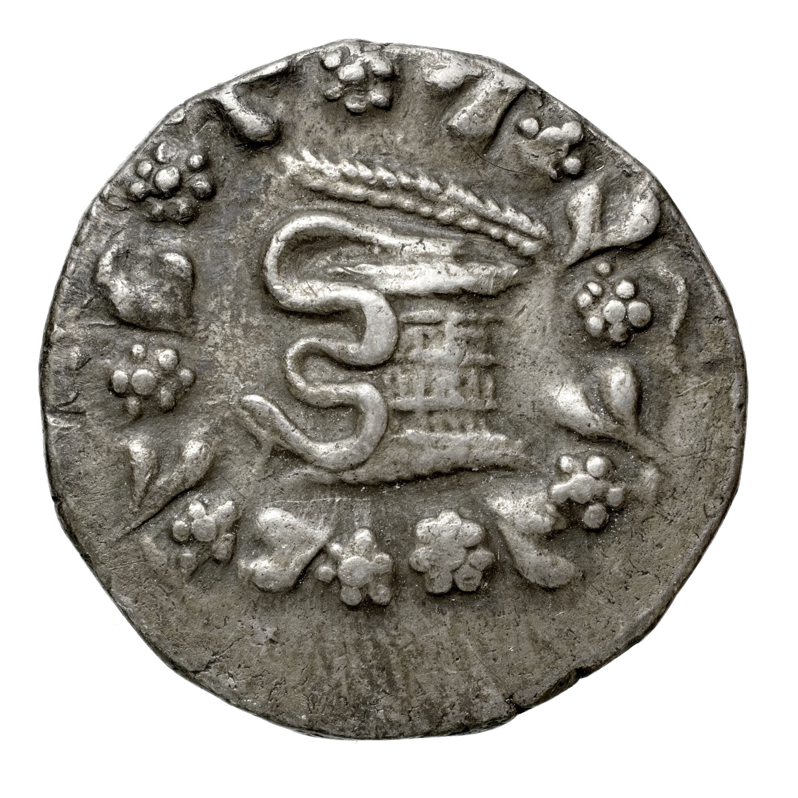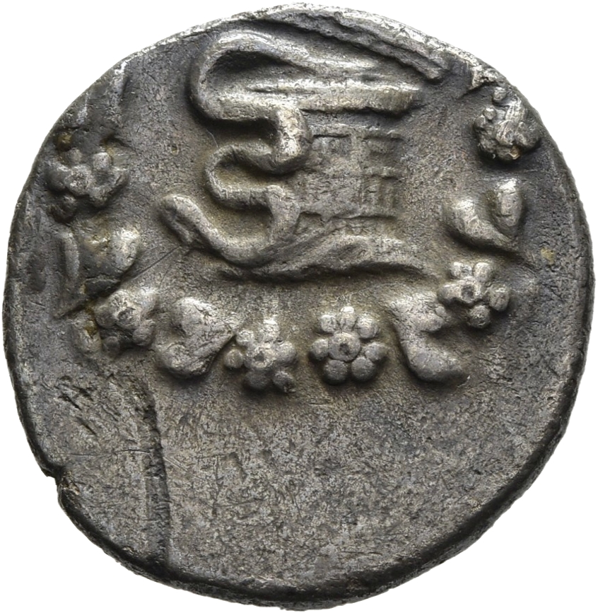 Gorytos (bow case) decorated with an aplustre and containing a bow between two intertwined snakes; to side poppy-head and corn-ear -[en]