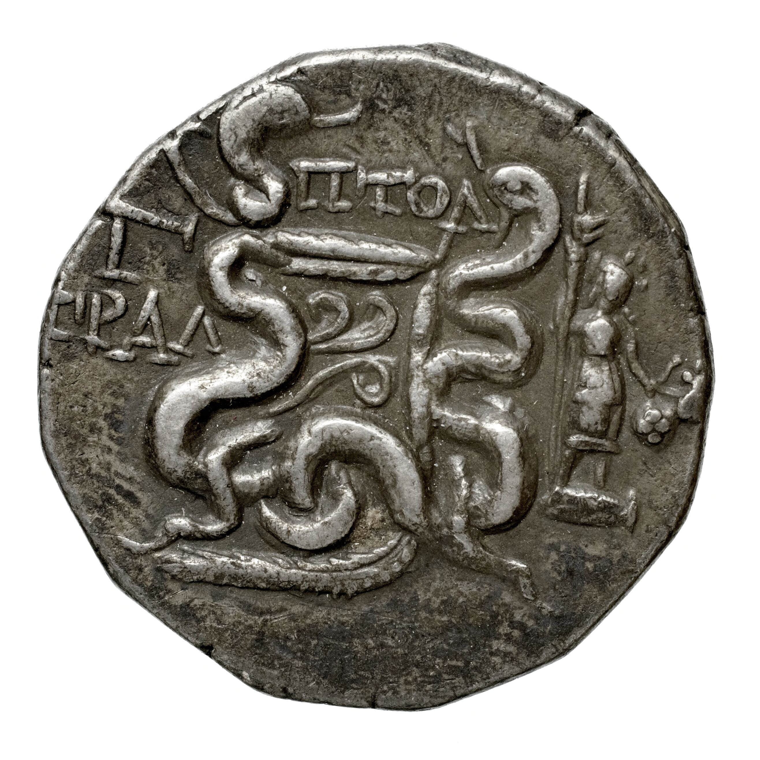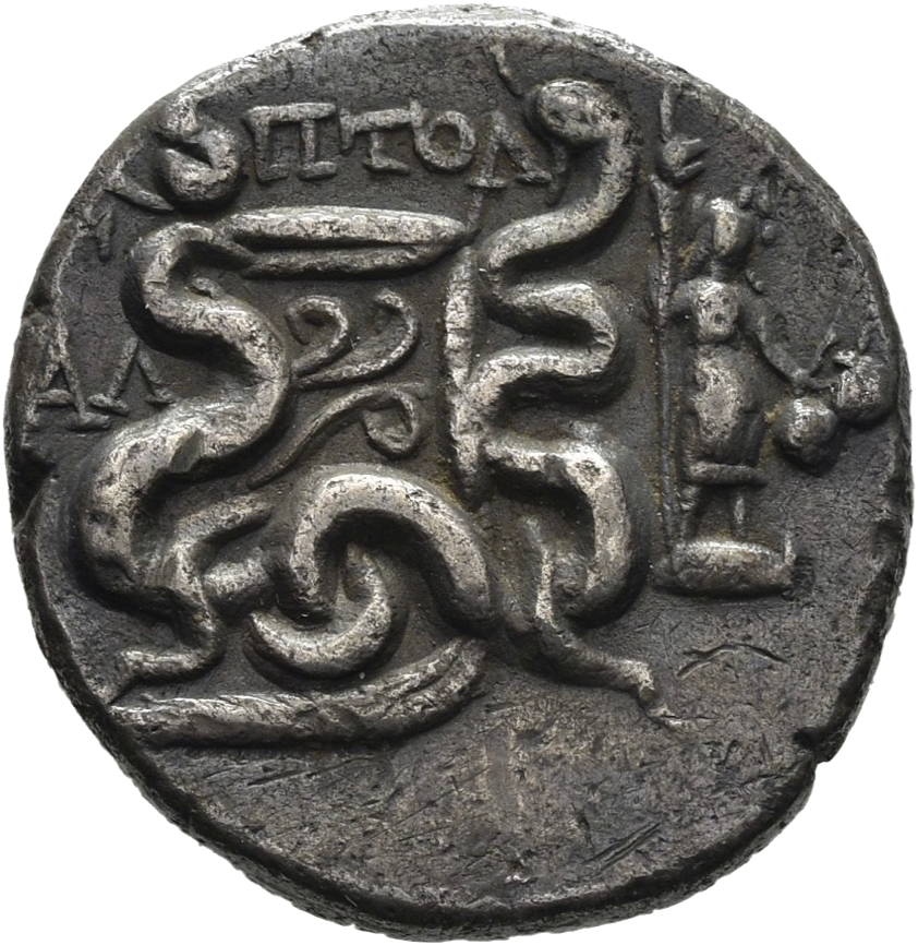 Gorytos (yay kılıfı) bir artı işaretiyle süslenmiş ve iki iç içe geçmiş yılan arasında bir yay bulunan; yan tarafta haşhaş başlı ve mısır koçanı bulunan
