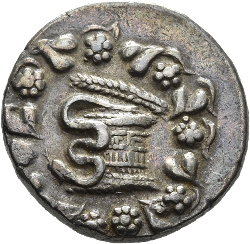 Basket (cista mystica) from which a snake emerges in a wreath of ivy -[en]