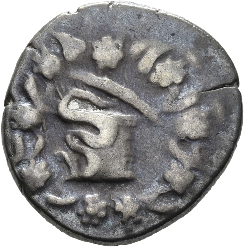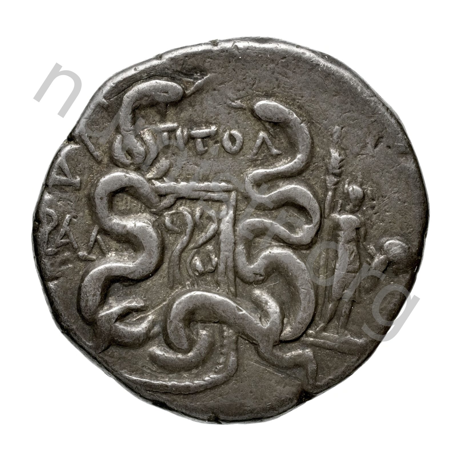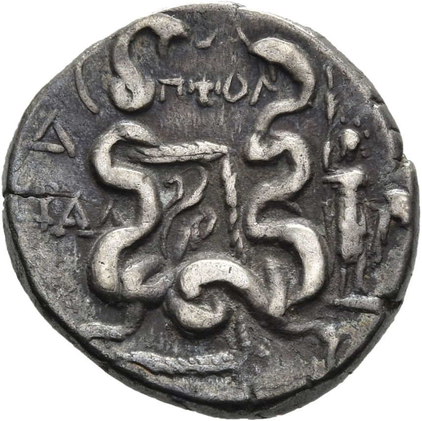 Gorytos (yay kılıfı) bir artı işaretiyle süslenmiş ve iki iç içe geçmiş yılan arasında bir yay bulunan; yan tarafta haşhaş başlı ve mısır koçanı bulunan