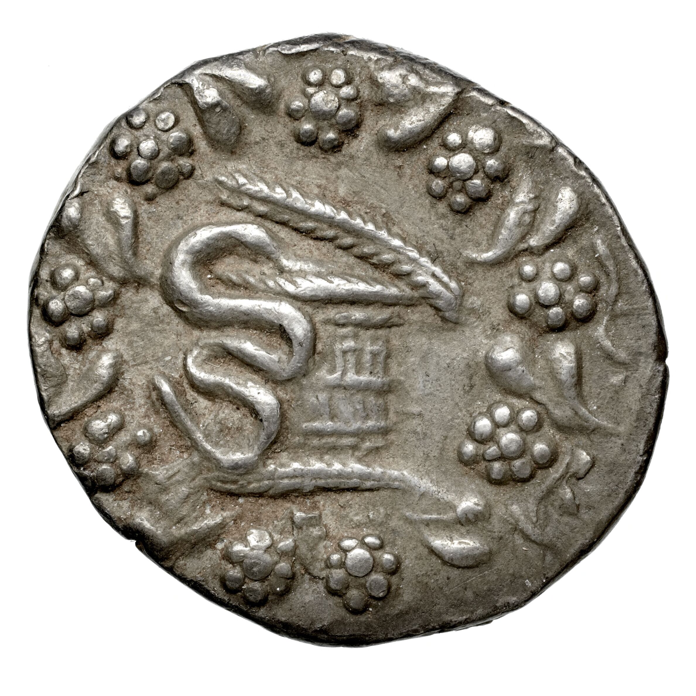 Gorytos (bow case) decorated with an aplustre and containing a bow between two intertwined snakes; to side poppy-head and corn-ear -[en]